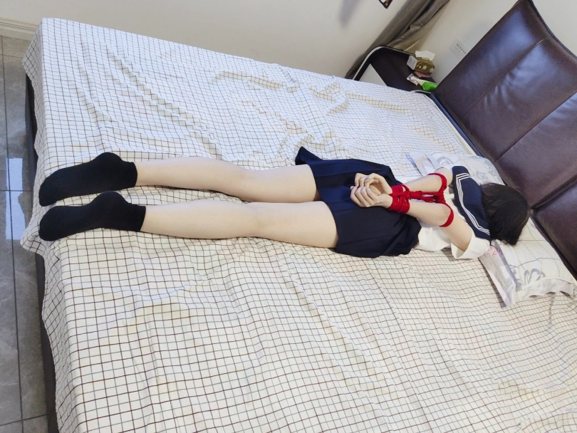 迷晕后将少女的双手严厉的直臂反绑,踢蹬的很欢实的黑色短袜小脚也并拢绑住。