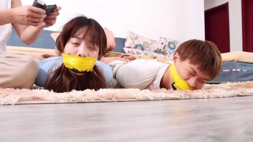 片段4:帅哥康行与女友小琛被歹人入室劫持后先用原味内裤塞嘴,二人互相解绳子被发现,歹人生气将他们捆成驷马并脱掉二人脚上穿的原味锦纶丝袜交换塞入情侣二人口中,并用胶布绷带一圈圈将他们嘴封严实。