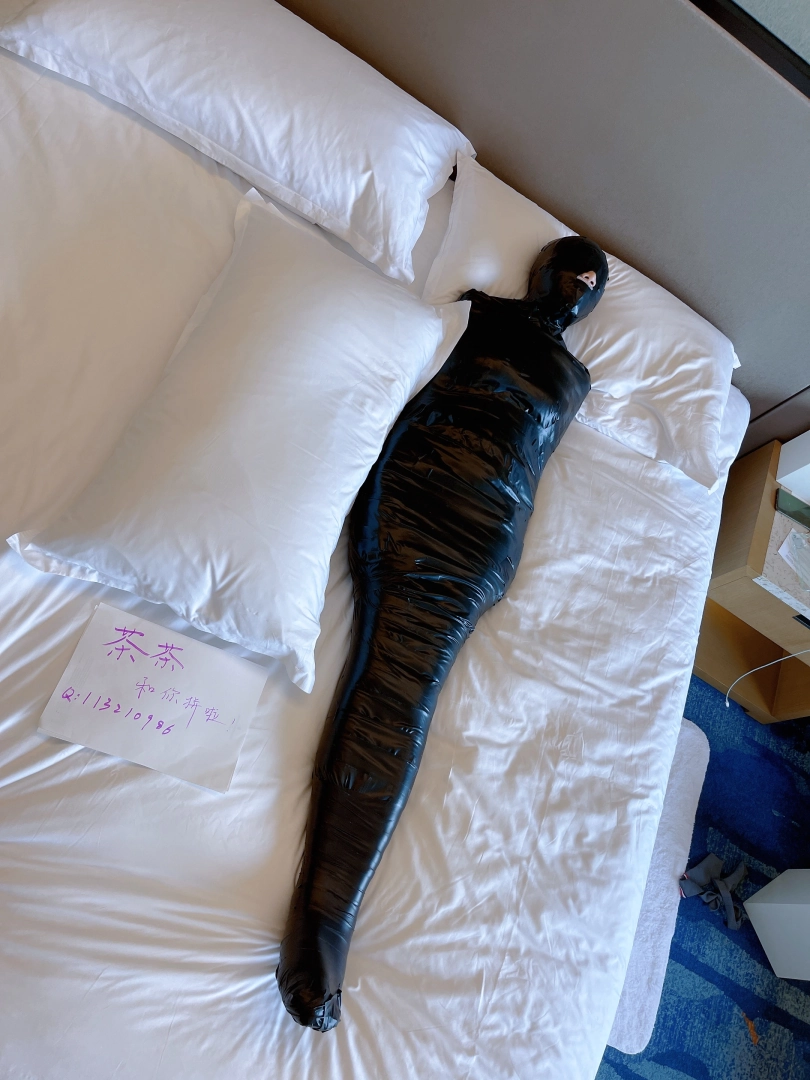 首先用保鲜膜和胶带把茶茶绑成木乃伊,绝对拘束没有一丝一毫脱出的可能。可爱的少女茶茶就这样从人变成了一个物品,只能静静放置着。娇小可爱的身体被黑色胶带包裹后更加像一个可爱的艺术品一样。