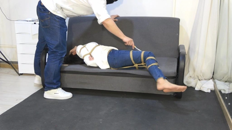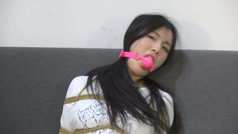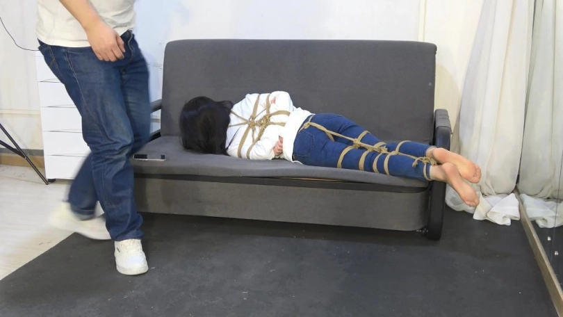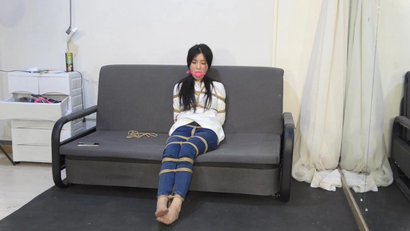 小狐狸穿着紧身牛仔裤,被全身捆绑,不断挣扎。丝袜堵嘴,口球塞嘴。