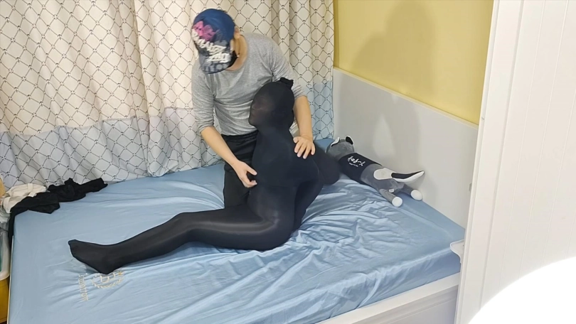 妹子在家分别穿上灰色和黑色Zentai玩,然后被183猛男用很多超紧黑色后丝袜完美包裹,无情的厚实亮黑丝袜来回单手套全包外加超紧丝袜睡袋,按摩调教,难受,长时间无助挣扎最后没有力气躺尸放置!本片为上下两集合体发售,包含很多元素!超值,包括部分按摩失禁镜头,有些为定拍版权镜头不能发表。多层厚丝袜拍摄不易,面部多层压迫难受,妹子比较娇气!喜欢的下,多视角远近镜头看个过瘾。