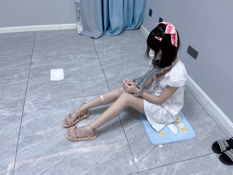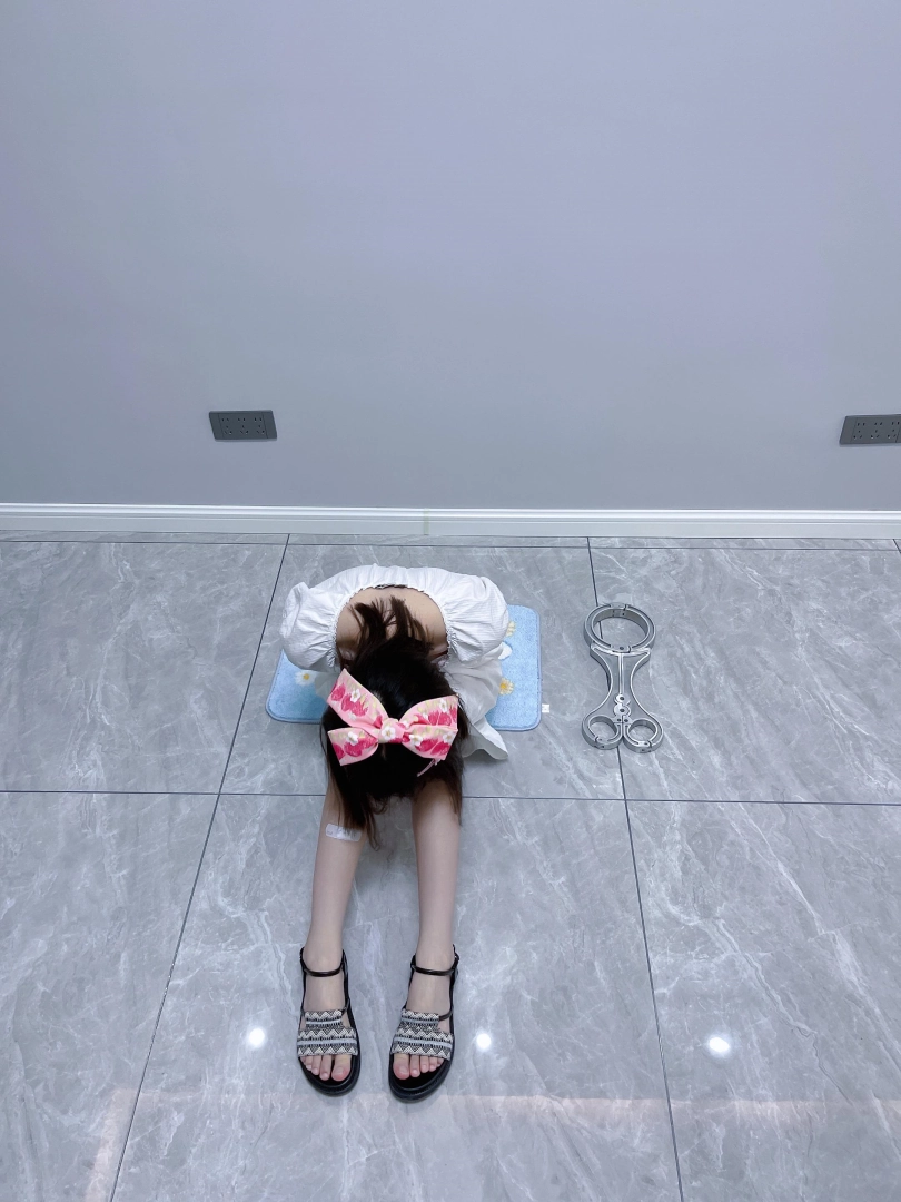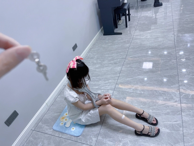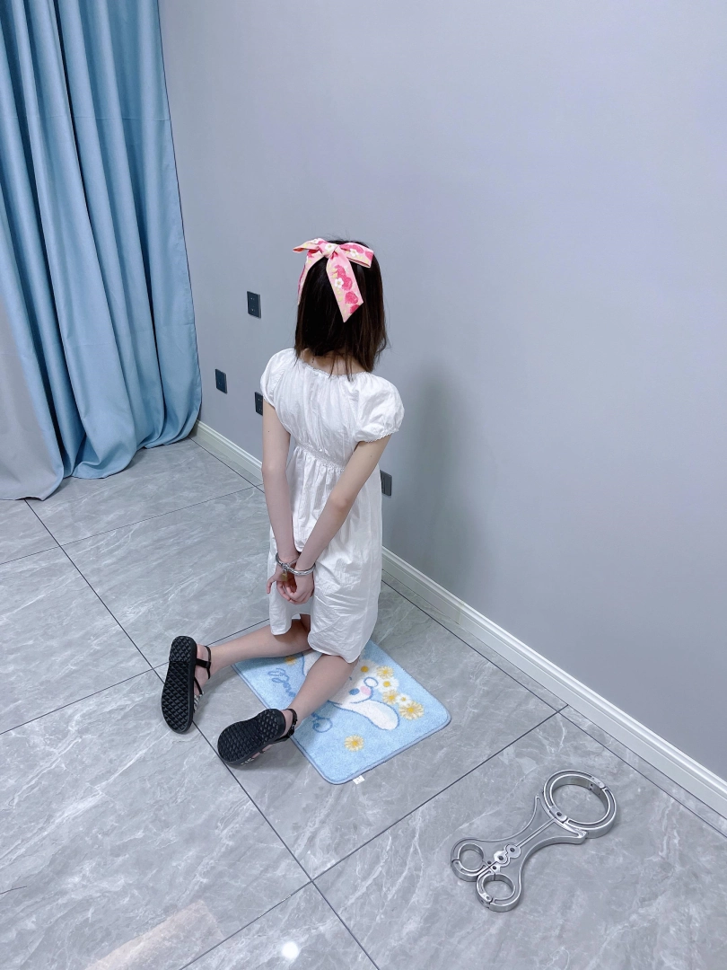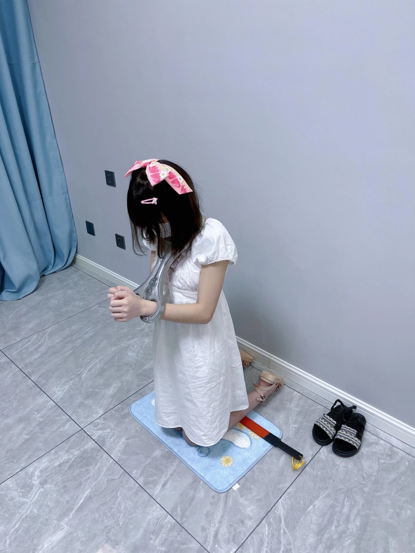 更换监狱内两种款式的凉鞋并展示。让小囚犯茶茶跪在地上,面壁思过。