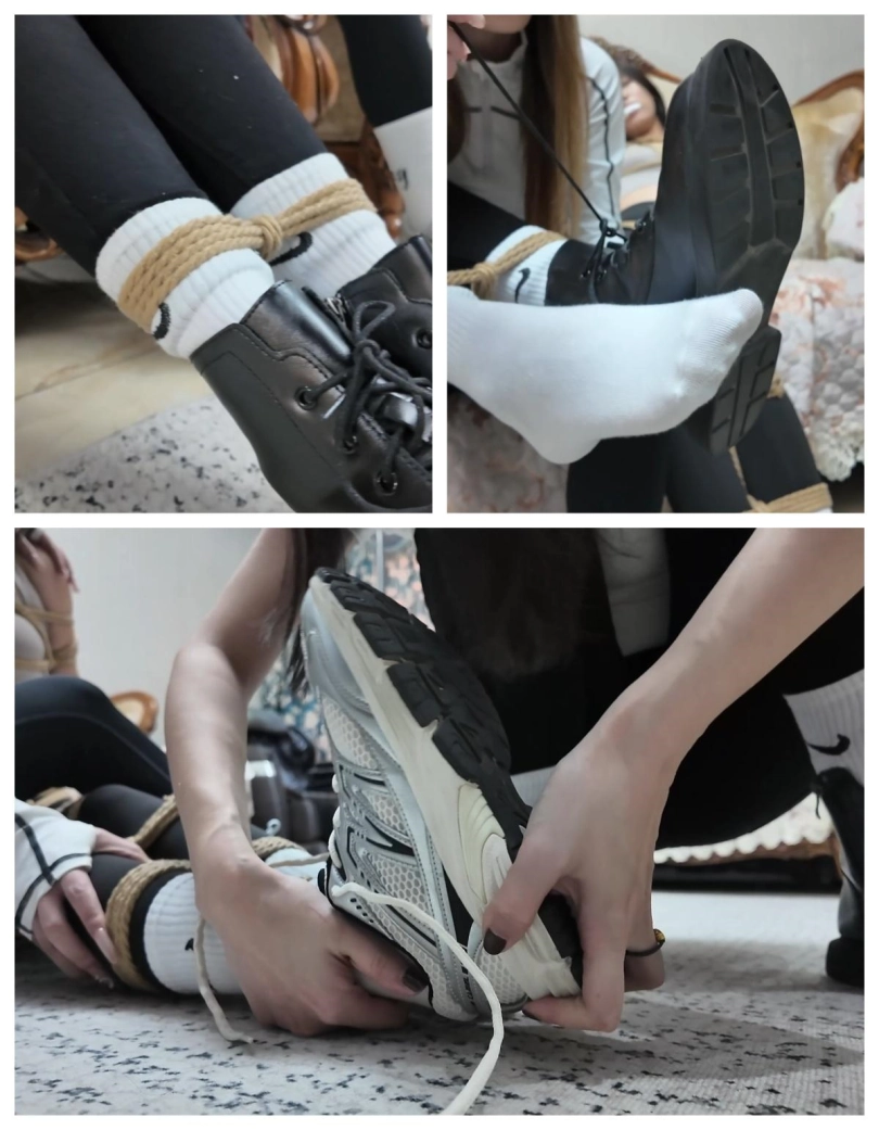 芷溪正在按摩椅上舒服的享受着全身按摩,门铃响起,芷溪开门,门外站在两位身材高挑的美女,经过了解询问得知,芷溪妈妈在国外得罪了,怕坏人打击报复芷溪,所以请来了两位女保镖(雨诺和柠琪)前来保护芷溪安全;了解清楚后,芷溪招呼两美女保镖进门入座,可是娇生惯养的刁蛮大小姐想借机会和美女保镖们玩个游戏,于是,就想出各种问题对女保镖进行刁难,脾气不好的美女保镖柠琪率先不满,这也给了芷溪名正言顺的捆绑制服女保镖柠琪的机会,芷溪答应给雨诺加工资,让雨诺听她的话,接着两人一起上,把柠琪结结实实的捆绑起来(捆绑入图)。桀骜不驯的柠琪骂了芷溪,觉得芷溪侮辱了她,这可把芷溪惹怒了,随后便命令雨诺拿来一块厚白毛巾,将一大块白毛巾满满塞入柠琪嘴里,毛巾将柠琪的口腔都塞满了,让柠琪的叫喊声变成了呜呜声。捆绑堵嘴好柠琪后,芷溪觉得不过瘾,不如把柠琪当成个玩具,好好玩弄一番,于是芷溪和雨诺一起对柠琪进行了挠痒痒的玩弄游戏,二人四双手在柠琪的脖子,脸,腰部大力的挠着,柠琪呜呜呜难受着,光挠上半身,芷溪还觉得不够过瘾,将眼神瞄向了柠琪扭动的,那双瑜伽裤,白棉袜,运动鞋的双脚上。好戏开始,雨诺解开了柠琪的鞋带,慢慢地将柠琪的运动鞋扒了下来,露出了柠琪的白棉袜双脚,这可把芷溪弄兴奋了,开始疯狂的挠起柠琪的白棉袜双脚,看着柠琪难受并发出呜呜呜声的样子,好不开心!