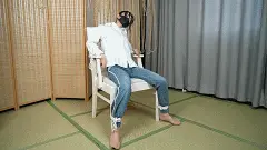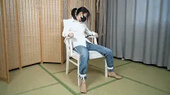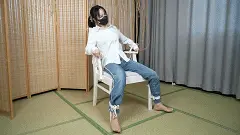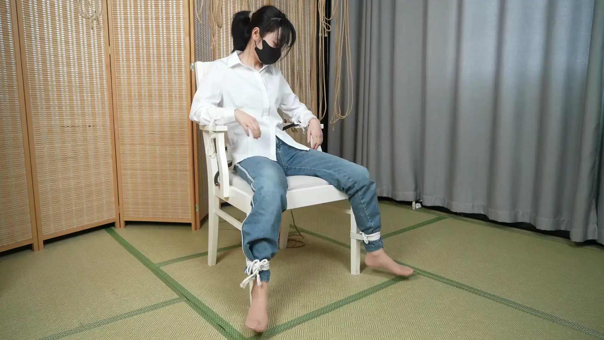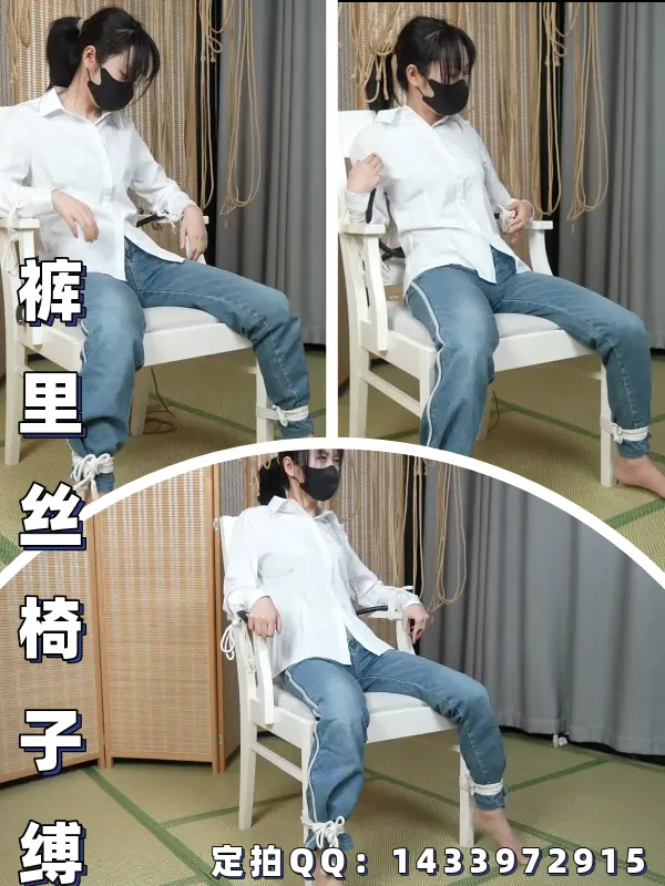 被绑起来之后,上身穿着这白色衬衣的她正被歹徒绳索缠绕,而她的双手的手指却也被歹徒用电线缠绕住,固定住,捆绑住!
