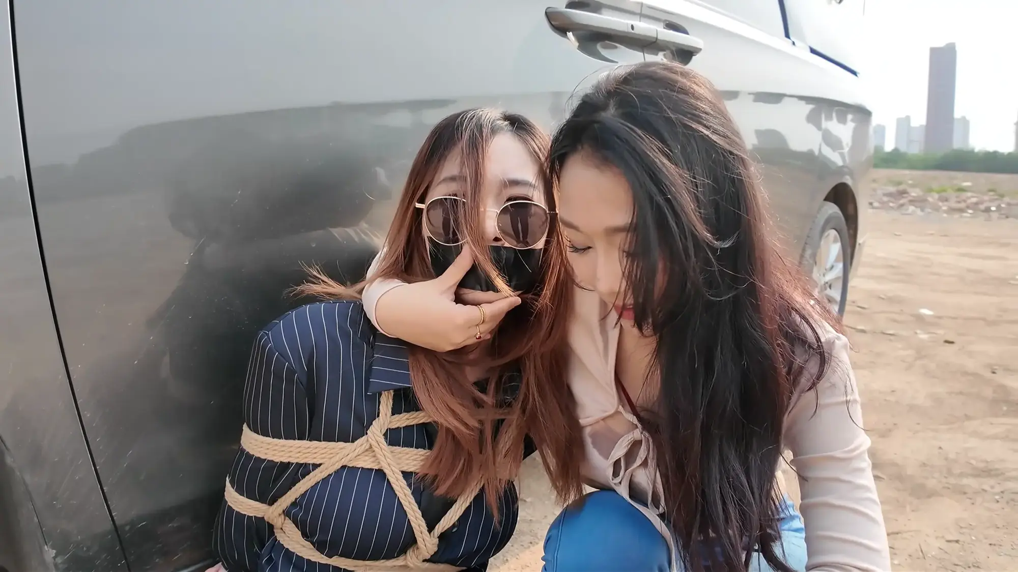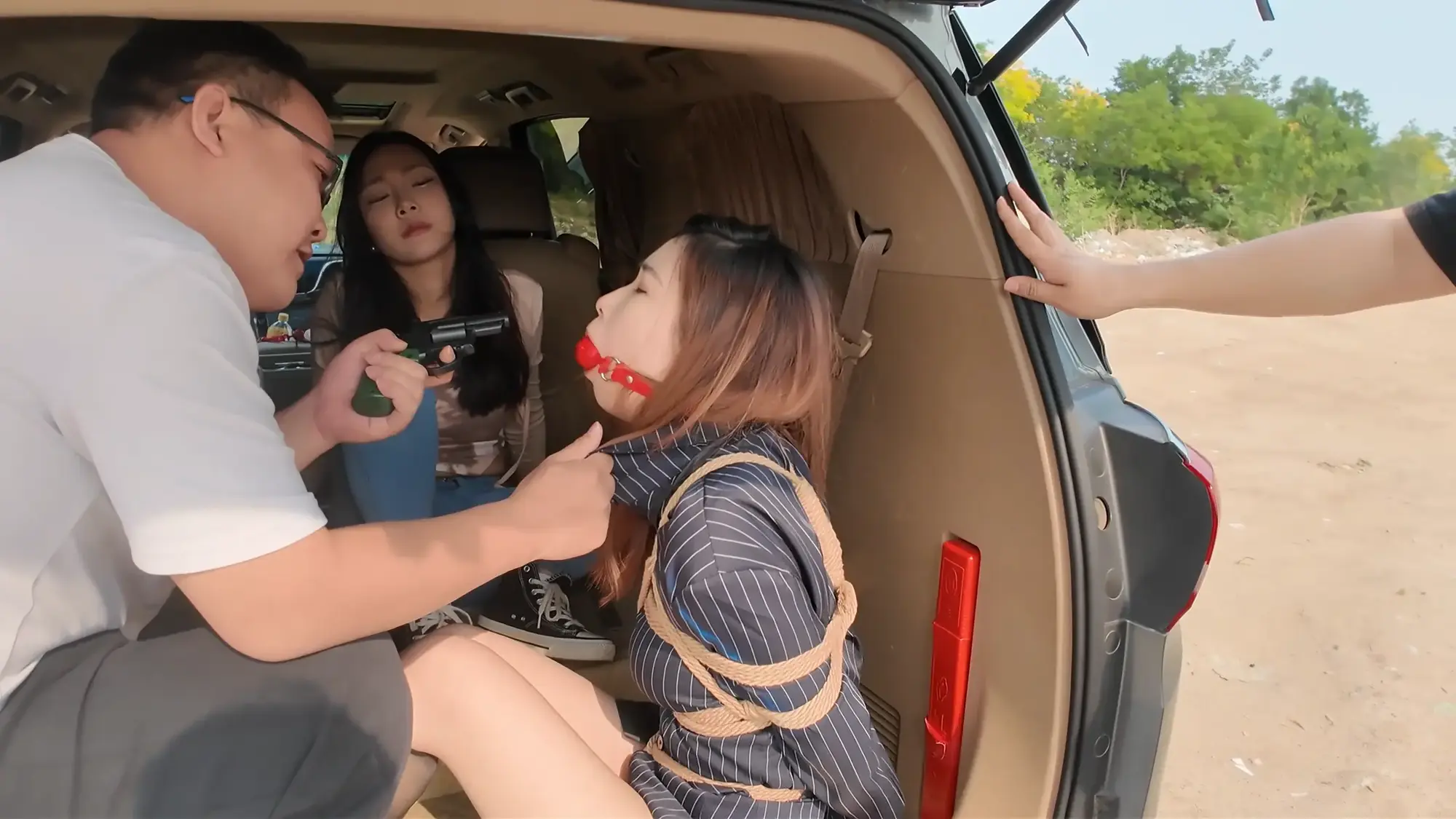 半路中,南清苏醒开始呻吟挣扎,躺在后备箱睡着的雷姐被吵醒,正当准备教训南清的时候,车忽然急刹,雷姐训斥小弟得知是汽车爆胎泄气,三人无奈只好暂时原地休息,两位小弟见南清肤白貌美起了歹心,突然雷姐背后拉开了两人,命令他们什么也不许做,赶紧想办法把车修好。两位小弟很不情愿的蹲在一边抽烟,雷姐开始挑逗南清,表示她这么极品的“货物”可不能让那两个废物小弟糟蹋了,想起卖掉南清后马上就能名利双收,雷姐大笑了起来,一旁的小弟敢怒不敢言,只能偷摸的骂雷姐泄愤。