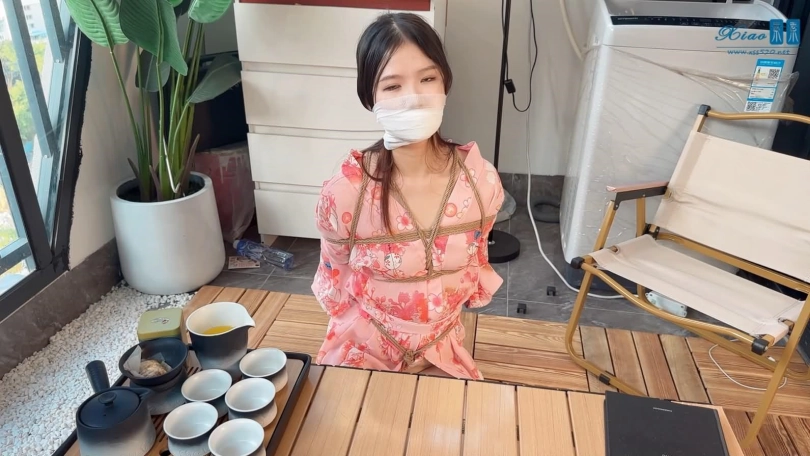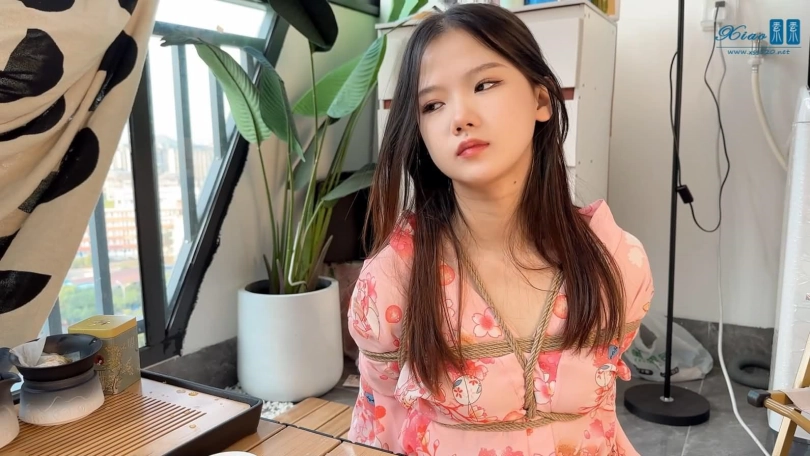 美女模特佳佳粉色和服绳艺品茶