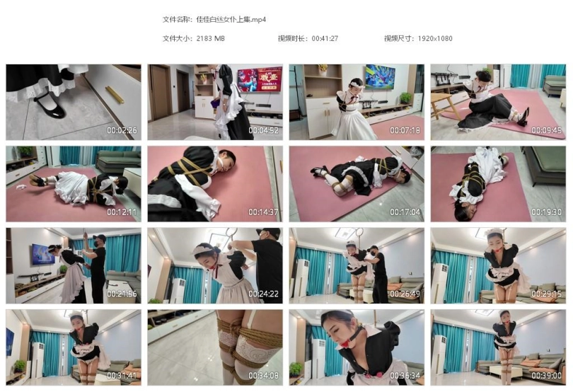 男子将绑架来的人妻装箱带走。回到家后开箱,经过一个月短暂的调教,佳佳暂时成为男子家中的女仆。不过这只桀骜不驯的小野猫似乎不太好训,于是男子借佳佳摔碎碗的契机,再次展开调教。他将佳佳绑好在客厅中,假装要离开。佳佳见机会难得,于是便努力挣扎,试图去到窗边呼救。就在佳佳快到窗边时,男子一把抓住佳佳,把她从希望的边缘一把拉了回去进一步调教。接着男子在客厅中吊起佳佳后手,给她戴上口球并且用绳子拉起口球带,强迫她抬起头,然后拉起裙子绑上股绳再扒开佳佳胸前的衣服,往两胸各塞入一颗[X_X]。只见佳佳被[X_X]刺激得口水直流站立不安,下身又被股绳勒住,只能不停地发出呜呜声祈求男子放过她。再往后,男子决心一步到位,接着将佳佳绑成个单腿吊缚,并且在下身加上个棒棒,两胸前的蛋也调至最高档,就这样,将佳佳调教至几近虚脱。最终,桀骜不驯的野猫终于被驯服,含住了象征屈辱和臣服的水晶柱,就这样佳佳调教成功,正式成为了男子家的奴隶女仆。开头的开箱环节是上回拍的时候让老哥顺便给拍的,开箱环节看得真爽。这回为了想看到的经典英伦风格女仆专门去按照佳佳的身材定了一件,白丝也换成稳重沉稳一点的,效果也是非常棒。全片一共三个段,因为时长和大小限制就先分成上下集了。老哥那拍摄的手法和认真程度真没的说,一如既往地敬业,我想看的就是这端庄典雅的女仆被一点点调教得下流,衣服从穿得整齐慢慢变成暴露又凌乱不堪,在这部里都给拍出来了。特别是佳佳这次化妆的妆容比第一集的效果还棒,挣扎的表演也是一如既往的卖力,第二段的时候戴上口球后口水流了满地。
