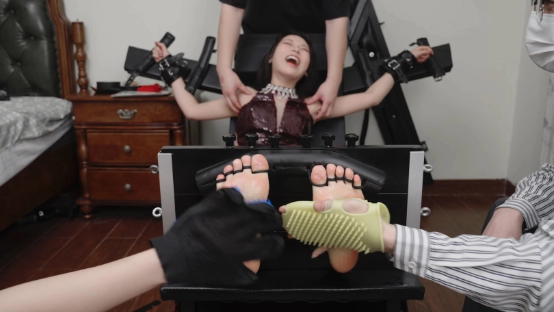 视频内容:随后我把艾米绑在束缚椅上面,她超怕痒所以很抗拒。