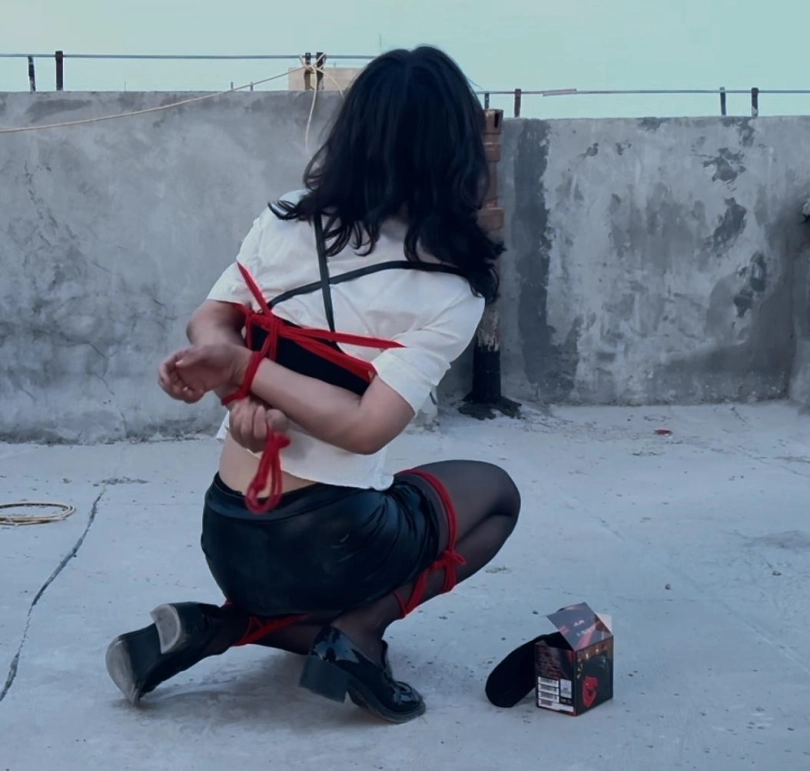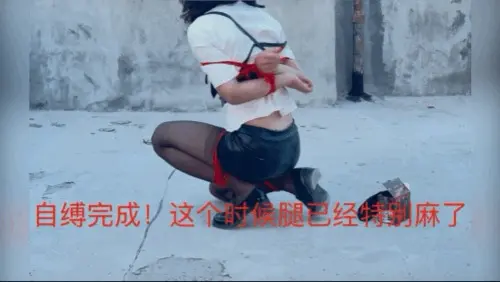 这次用的是两条十米的绳子,一条用来做一个简单的折腿缚,一条绑了一个日式自缚,因为天快黑了,甚至能在视频里看到日光逐渐变暗的过程,以至于后来闪光灯都自己启动了。这次绑好腿后,膝盖和双腿以及被小皮鞋包裹的脚就一直特别难受特别疼,绑好以后就想着赶快解开,结果还是费了好大力气才勉强解开。