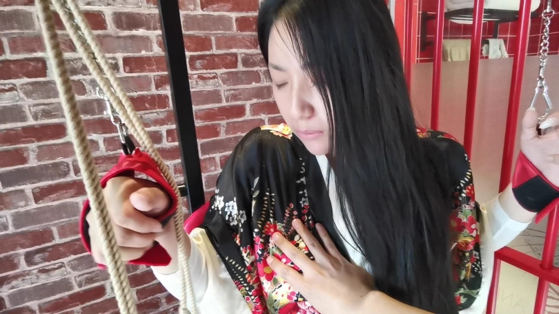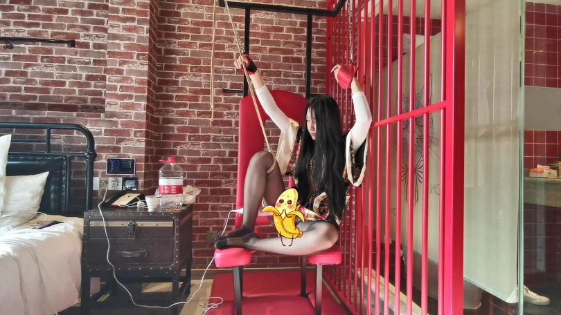 设定了一个有意思的想法,把模特单腿掉在椅子上,用绳子把快感棒固定在模特的[不可描述]敏感处并打开开关调整到最大频率。这时模特有两个选择:可以保持一个比较舒服的姿势不累,但要面对快感棒的紧贴敏感部位的超频刺激;另外也可以调整身体姿势使快感棒对敏感部位不是那么紧,刺激感相对小些,但这种姿势却很累、难受。最后弄得模特坐也不是,站也不是。视频种模特被折磨的不断的变换着姿势。