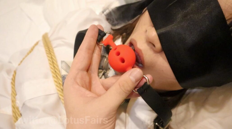 穿着可爱的花色白丝,直接把绑着的双脚吊到浴缸上头,这个姿势超级难受,然后命令沐雪把嘴巴张开,雪雪很听话的把嘴巴张开,慢慢的把口球,放到嘴巴里