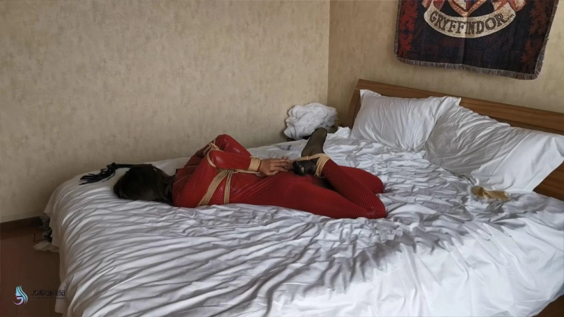 瑾萱穿着红色皮衣,手被单手套束缚,戴上口球,穿着高跟靴的脚也被镣铐铐住。鞋跟比较高,这让她每走一步都很艰难。抽打让她走到楼梯口,可能是她担心有人会过来,找了个借口便回到房间。坐在床上解开她身上的束缚,用[不可描述]棒刺激着她让她体验[不可描述],很快她便呻吟起来。接下来用绳子把她绑成驷马,嘴里塞着丝袜并用胶带封住,防止她吐出丝袜。再用一条丝袜套住她的头,蒙眼。无意中在她的袋子里发现了她穿了一天没洗的丝袜,正好派上用场。把丝袜揉成一团,放在她的面部,让袜尖部位,也是味道比较大的部位放在她的鼻子处。这味道威力还是蛮大的,刚放进去瑾萱就受不了,剧烈的挣扎着,嘴里含糊不清的出说“我不能呼吸了,这袜子太味了。”过了一会感觉她坚持不住了,便解开束缚,瑾萱也瘫在床上。
