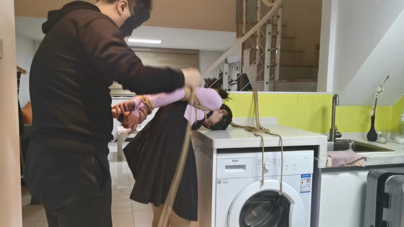 琳洛被团缚捆绑起来,让她坐在台子上,用假YJ口塞塞嘴,眼罩蒙眼。下面被塞进DD刺激着,头部也帮着绳子固定在栏杆上,使她强迫的抬起头,这种姿势很难受,在加上下面的强烈刺激,不一会就被虐哭。。。