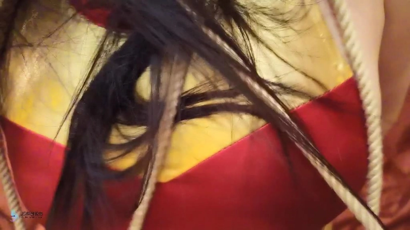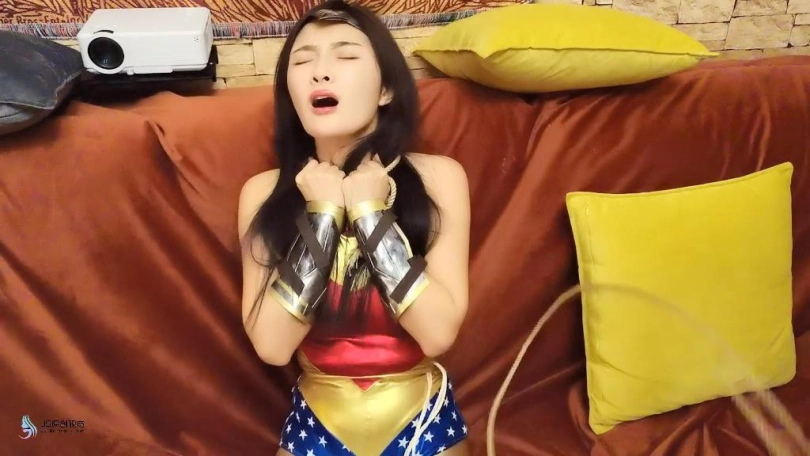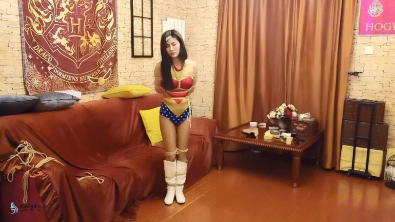 女超人潜入房间调查,却不知自己已经身陷陷阱中。发现桌上有很多绳子,正在疑惑时候,一条绳子从后面突然袭来缠住了她的脖子,并将她拉到沙发上。女超人奋力的挣脱着。但她的脚也被绳子缠绕束缚了起来。双手也被绳子缠绕,拉扯到身后束缚起来。越来越多的绳子开始向女超人袭来,被束缚的女超人只能惊恐的挣扎着。。。