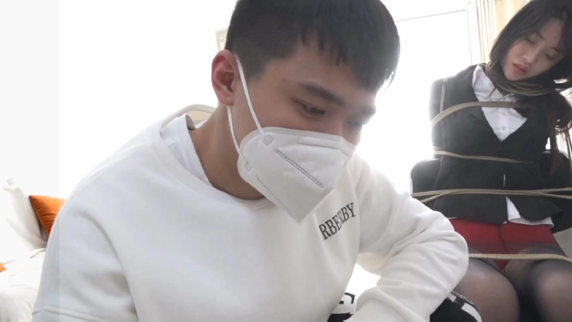 男人将一双黑色丝袜套在了RF的头上,然后将她双腿的裤子褪到膝盖处来羞辱她,将她的鞋脱掉放在脚边。然后离开了