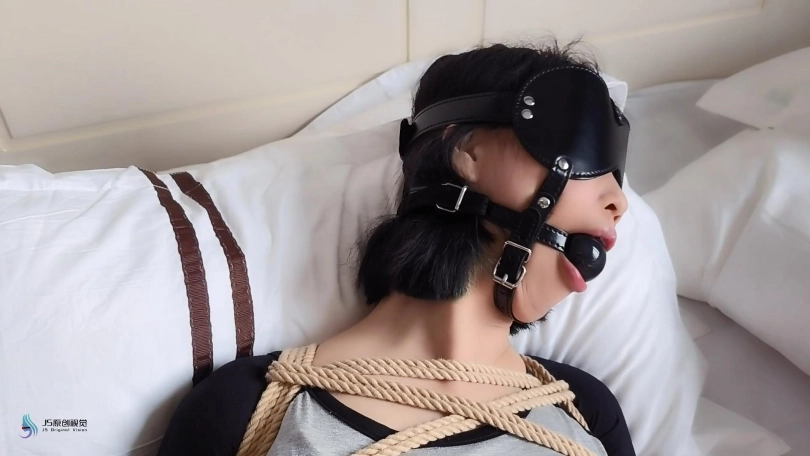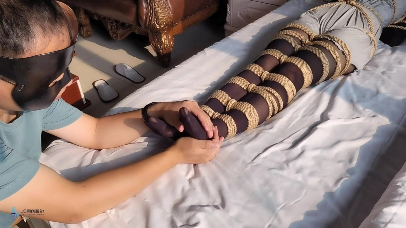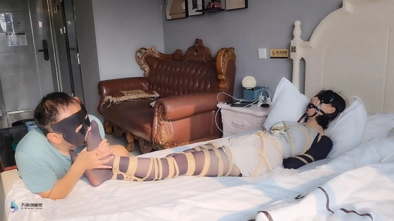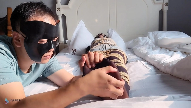 激辣在家无聊的刷着手机,突然想起敲门声,激辣起来去开门。就在开门声响起的同时,也传来了激辣被捂住嘴巴发出的“呜呜”声。当画面再次亮起时,我们的主角激辣躺在床上,身上盖着被子。她的嘴上戴着马具型口塞眼罩,她看上去很安静,应该是在睡觉。这时坏人掀开了被子,露出了被绳子密集捆绑起来的身体。坏人开始抚摸起激辣的脚丫。随着不断的触摸,激辣也清醒了过来,发现自己被束缚的不能动,惊恐的“呜呜”叫。但这更激发了男人的欲望,男人捧起女孩的丝袜脚开始亲吻起来,并时不时的挠着女孩的脚底。。。
