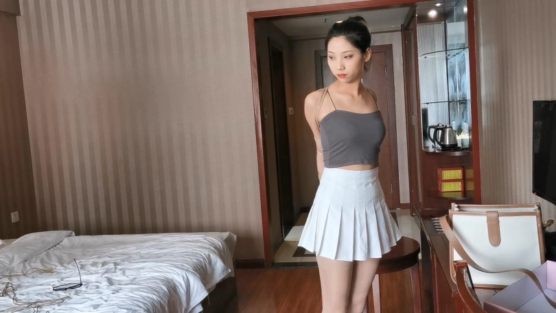 舞蹈生小松,以前没发现小松身材这么好,这身小吊带真的是把好身材都给显出来了,把小松直臂紧缚跪在地上,身前加一道绳子牵引,如果小松想直起腰来就得忍受绳子勒紧丰满的胸部,最后再给她戴上一个大号口环,放置在宾馆里,小松本来口水就挺多,在大口环的作用下口水哗啦啦的往下流,把裙子都打湿了。