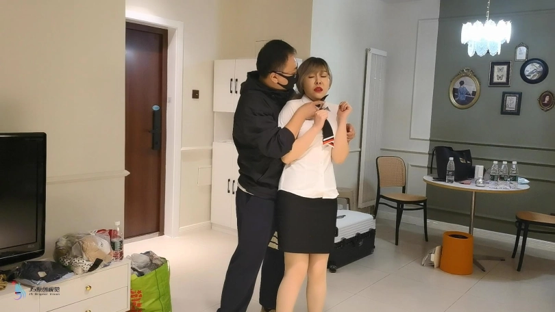 女人下班回家被劫匪入室抢劫,劫匪命令女人用胶带封住自己的嘴,并用绳子把她绑在椅子上,然后寻找财务。这时女人同事打来电话,劫匪让女人接电话,威胁女人好好配合。挂断电话后,男人命令女人脱下衣服进入卧室,在卧室里找到一双女人穿过的丝袜,塞进她的嘴里,并用胶带封嘴,捆绑全身。女人在床上不断挣扎。过了一会外面没有动静,女人以为劫匪已经离开,便起身跳到客厅逃跑。劫匪并没离开,被逮个正着,他解开女人身上的束缚,用扎带将女人捆绑,然后用毛巾塞进她的嘴里。并把她带到浴室,把她拴在淋浴杆上,劫匪离开。