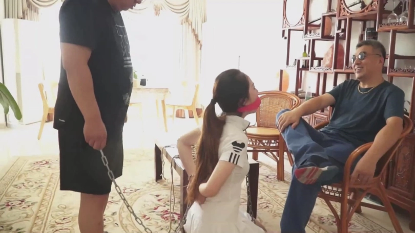 一个塞着嘴巴的女孩(依然饰)被五花大绑。撅着屁股跪在床上,双腿无法并拢,原来两脚踝被 一根金属棍