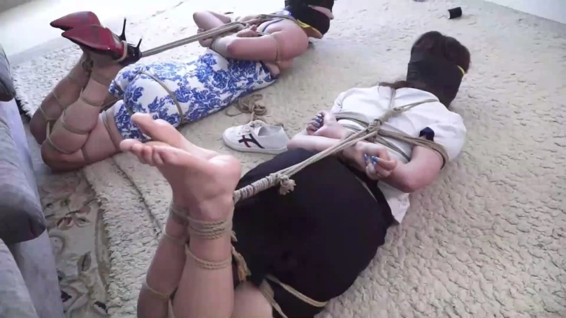 (五)被柳洋和丈夫捆堵并且头脚相对固定屈辱放置的吴晗与李佳欣经过努力终于挣脱束缚,撕掉封嘴绷带胶带拽出口中堵的脏内裤大口喘气,准备逃跑找机会再捆堵折磨柳洋。
