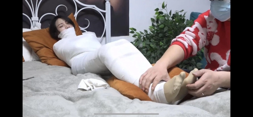 工作日的白天,白领赶回家里拿自己忘带的手机,刚打开卧室门发现屋内的东西被翻过,发觉不对劲想赶紧逃跑,却被带着面罩的歹徒从背后迷晕。白领从黑暗中醒来,发现自己被黑色胶带捆绑在床上,嘴巴也被胶带封着她无用得挣扎了一会儿,突然想起剪刀放在柜子里面,她挣扎着起身,警惕地看着卧室外面歹徒的动向,慢慢靠近柜子,挣扎着用双脚脱下高跟鞋,用脚勾出剪刀,挣开了束缚,白领小心翼翼地摸到门口,发现歹徒不在客厅赶紧跑,谁知和从厕所出来的没有带面罩的歹徒直接打了面照,歹徒下意识用手挡住脸却来不及,白领大声呼救,又被歹徒迷晕。歹徒喃喃自语到:“妈的,本来你安心呆着少点钱就没事儿了,看见我脸了算你倒霉。”歹徒将白领再次拖入房间,讲白领的手交叉放在胸前,掏出绷带……白领再次醒来,发现自己除了上半张脸和半个脚,身体全部被包裹,双手交叉放在胸前。