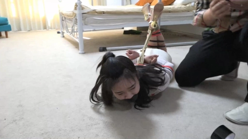 女孩被这一连串地捆绑感到有些害怕,真得开始害怕了。男人拿起摄像机满足地拍摄起来,将女孩恐惧的神情与被绑住的身体各部位都拍了下来(给一些模特身体的特写)。女孩开始大声呻吟求救,男人立刻控制住她,然后拿来绷带蒙住她的眼睛,再用胶带缠绕封眼。奄奄一息的女孩发疯似的在地上挣扎,一只鞋都被挣扎掉了。男人开心地用手机录像,记录女孩的困兽之斗。女孩凄惨地呻吟,呜咽,却没有意义。过了一段时间,女孩晕了过去。男人脱掉另一只鞋,玩弄了一会女孩的脚。