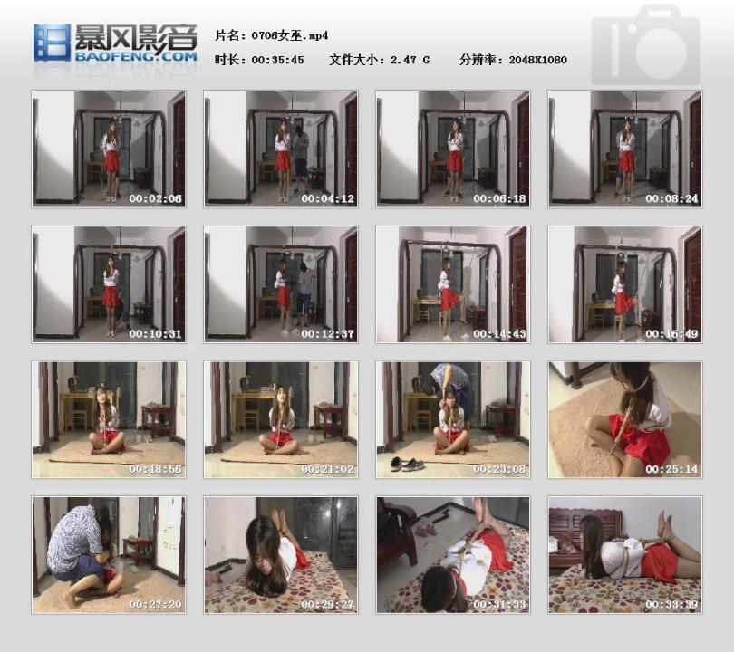 突然看到一部日片,一个巫女被绑架,然后蹂躏,可惜,日本片太难拍了,模特也很不好选,这次来了个新模特试镜,恩,童颜巨乳,胸部很丰满,于是就拍了这部片子,好了不多说了,上图,上片,希望大家喜欢了,纯日式捆绑,单脚吊,桃缚,驷马,丫头动弹不得,只能仍我......,好吧,大家请看具体视频。