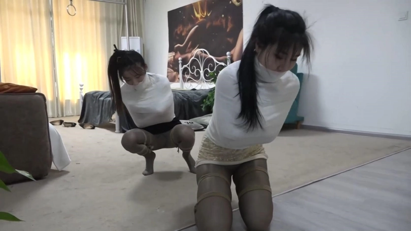 这次美女们丝袜美腿被折叠捆绑,美女们醒来蠕动挣扎,想下床但折叠的双腿没法下去,只能围着床边绕圈圈,好不容易2人想办法下了床,吃力的向大门爬行,大门钥匙就在门上,大门明显没锁,但讽刺的是2人折叠双腿正好够不到门把手,2个人只能回到客厅,发现手机,想用手机求救但又因为折叠的双腿爬不上沙发。最后2个被狱警发现,一番挠痒丝袜美脚折磨。