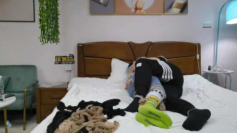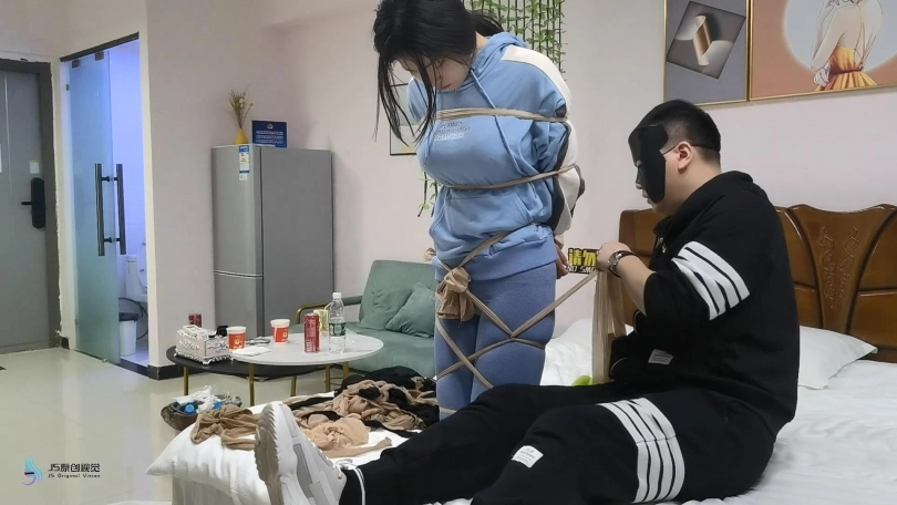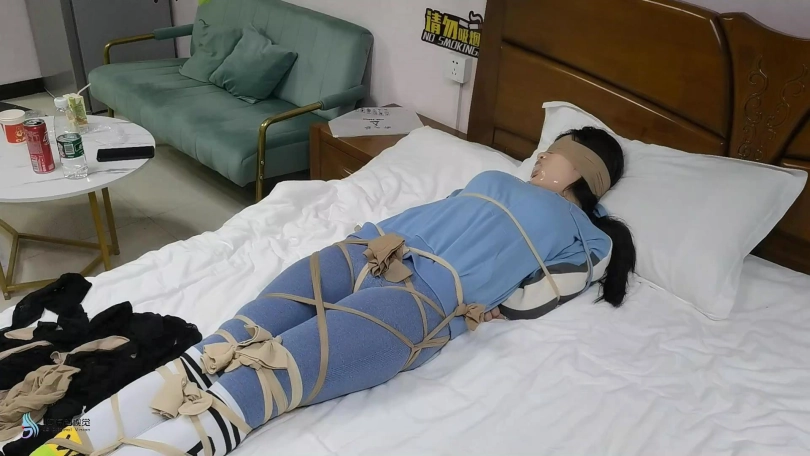 美女在外运动完回到家中,躺在床上休息。但是她忘记了锁门。一名劫匪悄悄的进入房间,并挟持了她。劫匪用她积攒没洗过的多天条丝袜,把她全身捆绑起来,嘴巴也塞进丝袜吧,并用胶带封上。劫匪不但劫财还要劫色。她不断的抚摸着美女。亲吻她的美足。搂着她入睡。当劫匪醒来时告诉女孩,告诉她乖乖的待着,他一会回来会有更好玩的。