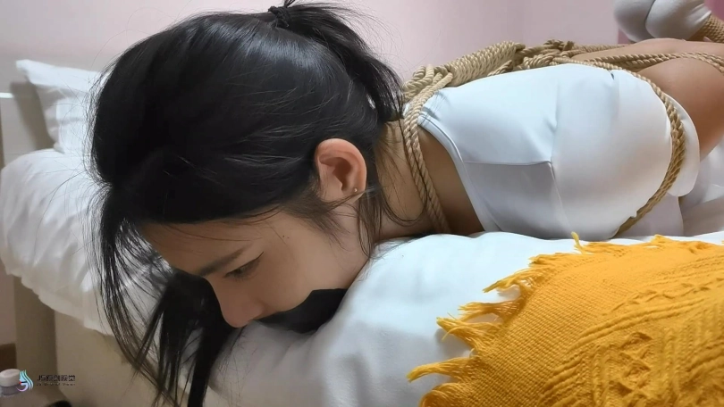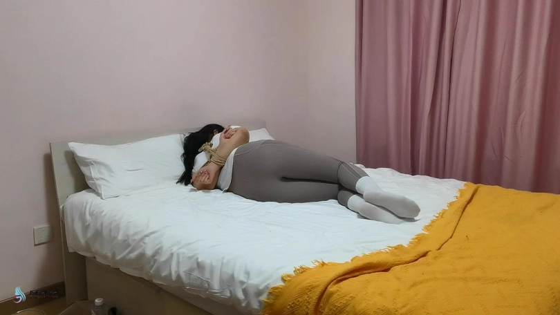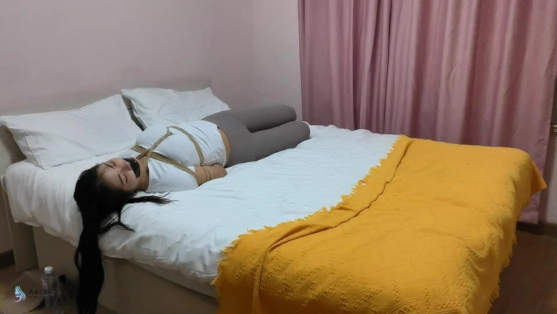 玖念来到旅馆房间,她躺在床上刷着手机,困意袭来睡了过去。但这时房间里窜出很多绳子,将她捆绑起来。当她醒来时惊恐的发现自己被捆绑起来。她想逃离这个奇怪的房间,但绳子根本不给她机会,就在她要下床的时,有一条绳子袭来,将她的双脚紧紧的捆版起来。正在玖挣扎时,她发现自己的嘴巴突然被胶带封住。她惊恐的趴在床上挣扎,但一股神秘力量让她的双脚抬起,并向后背弯曲。她被绳子绑成了驷马的姿势。。。