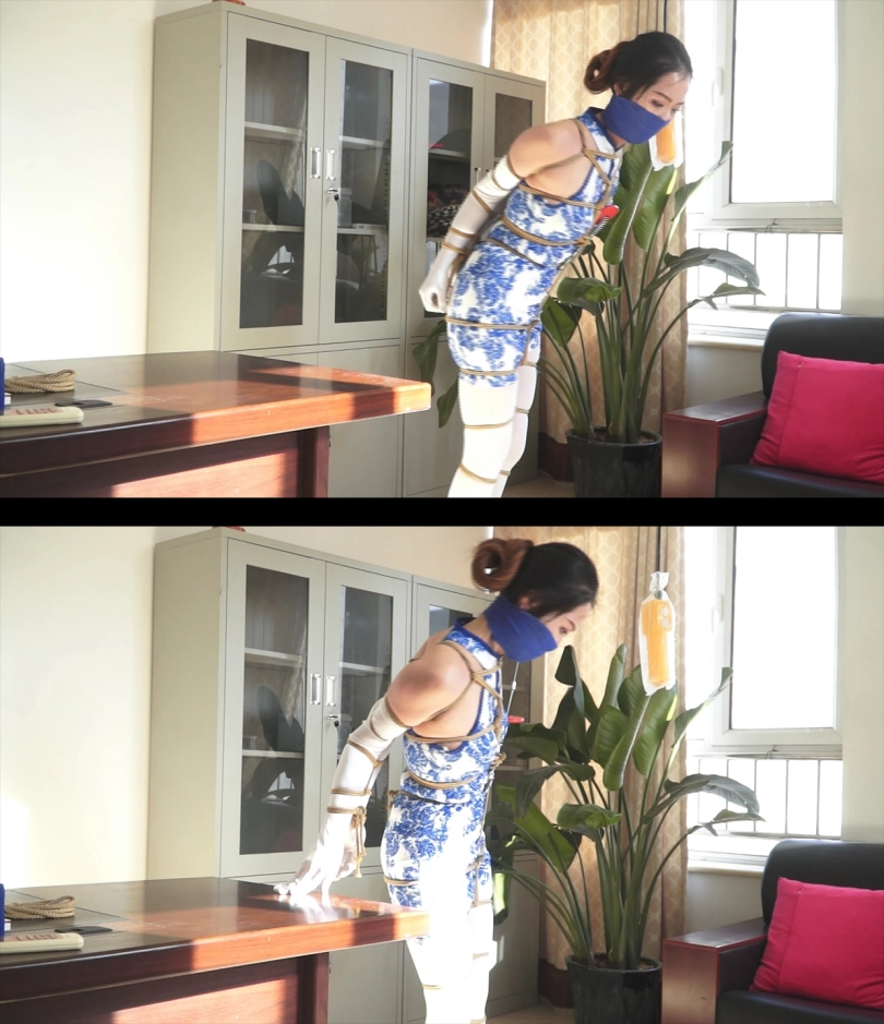 不知道过了多久,美女终于适应了被反绑的双手,她忍着疼痛终于握住了开关。用开口把自己放了下来。
