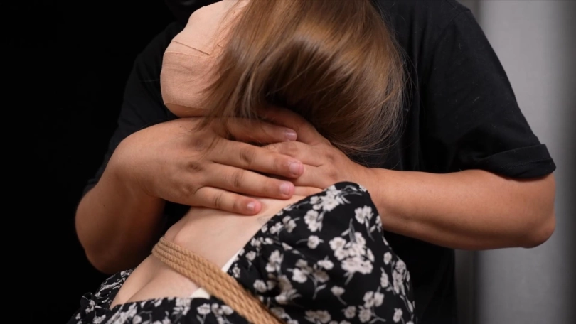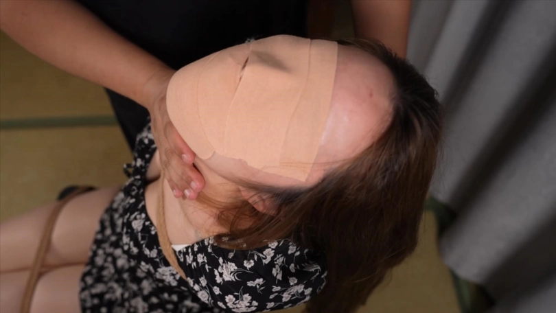 黑色连衣裙,肉丝,三叶草贝壳头,胶带蒙眼封嘴,双脚离地的椅缚!
