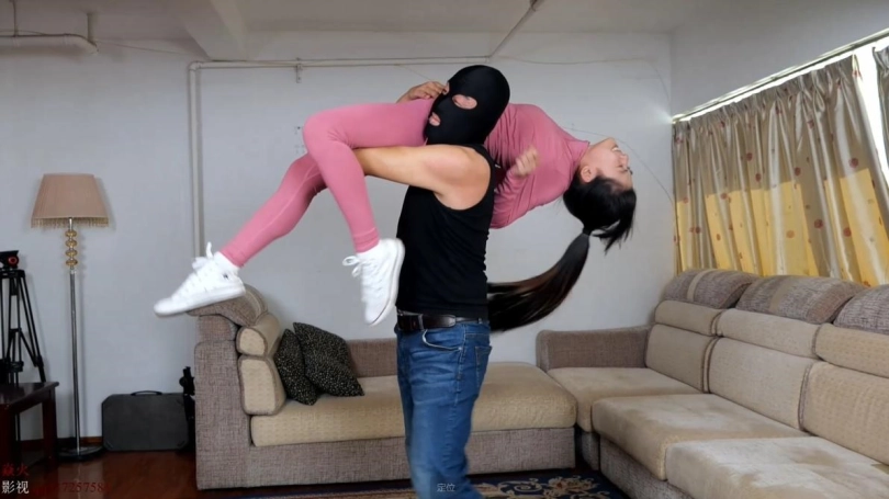 身穿全红瑜伽套装的希希回家途中被袭击,随后被拖回屋内不停扛起抗下。
