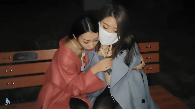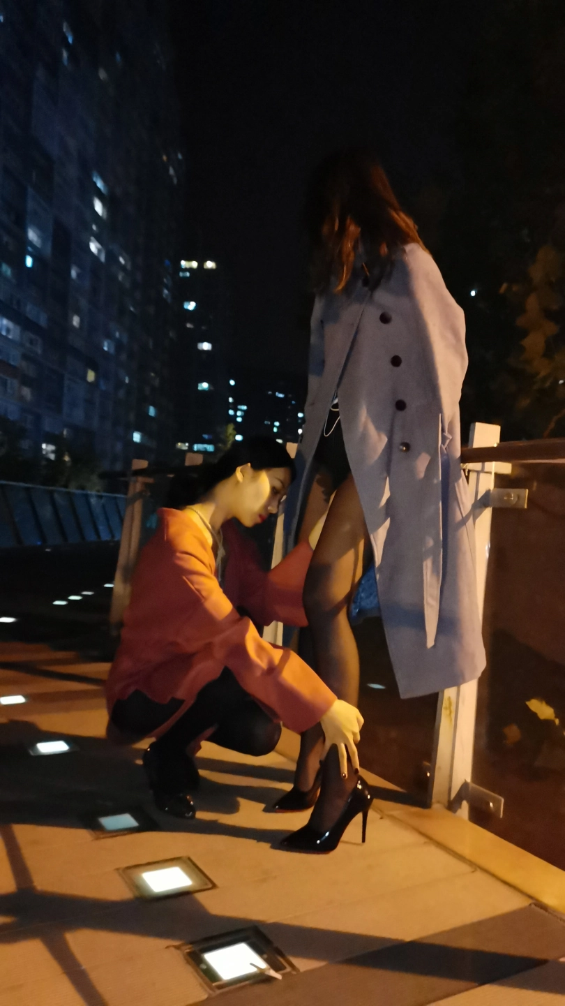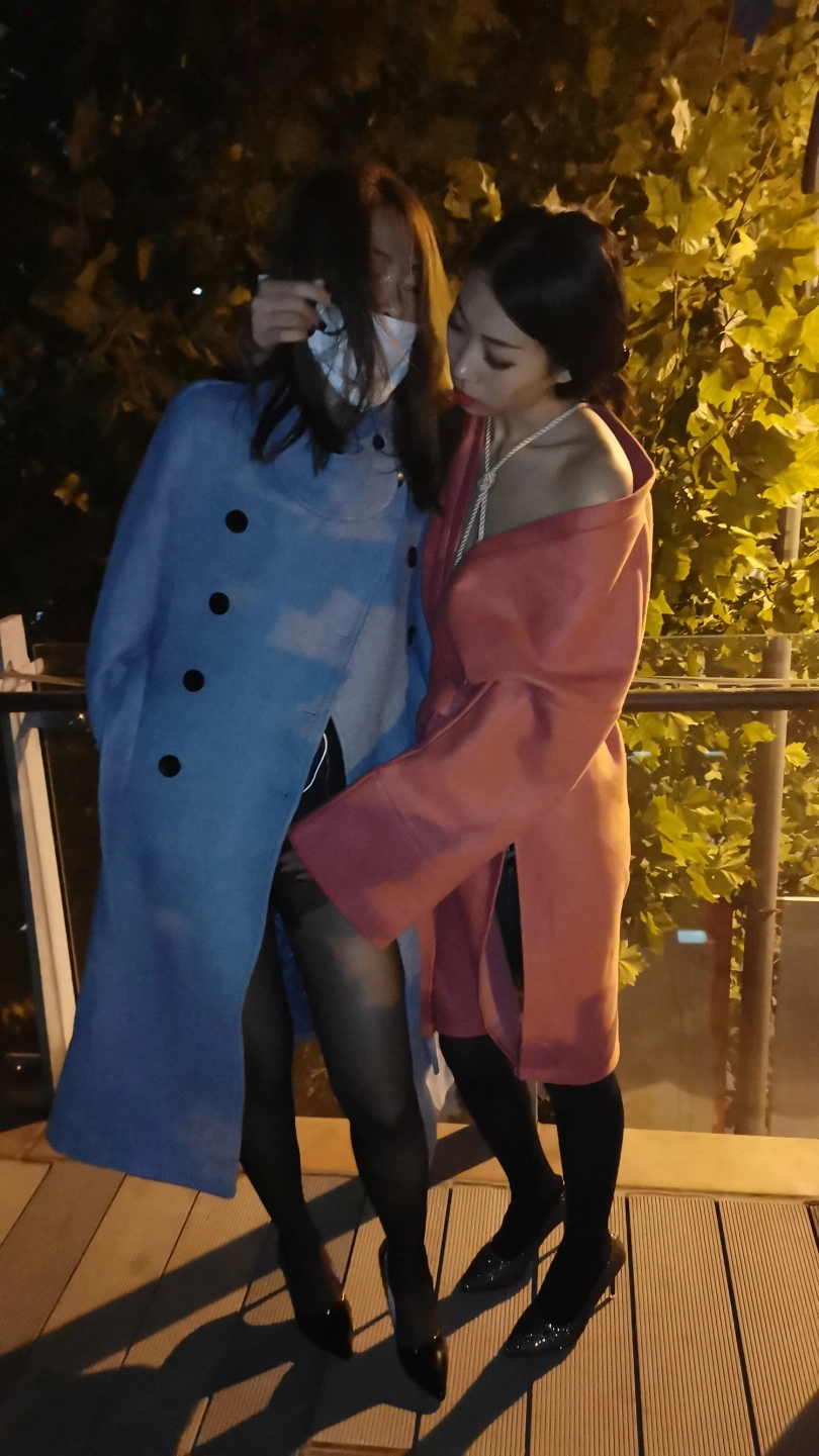 艾诺身上绑着龟甲,然后她把瑾萱也捆绑起来。瑾萱的嘴里被艾诺塞进了一条丝袜并用胶带封住。再戴上口罩避免别别人看到。艾诺将一个双头的ZD蛋放进瑾萱的敏感部位并打开开关刺激着瑾萱。两人只穿着内衣和连裤袜高跟鞋,外面披着外套出门。电梯里的哥们好像看到了艾诺衣服里的绳子,一直不停的看着,旁边的瑾萱不好意的将头转向一边笑着。来到公园的长椅上,两位美女解开衣服,艾诺挑逗着瑾萱的胸部和下面,并亲吻瑾萱。走到天桥上比较亮的地方,艾诺蹲下身子不断的抚摸着瑾萱的下面并亲吻着她的腿。最后来到楼梯间,瑾萱蹲在地上,艾诺脱下鞋子用脚摩擦刺激着瑾萱的[不可描述],并将脚在她的脸部摩擦让瑾萱闻着自己的脚。而瑾萱也被艾诺挑逗的不断呻吟。。。