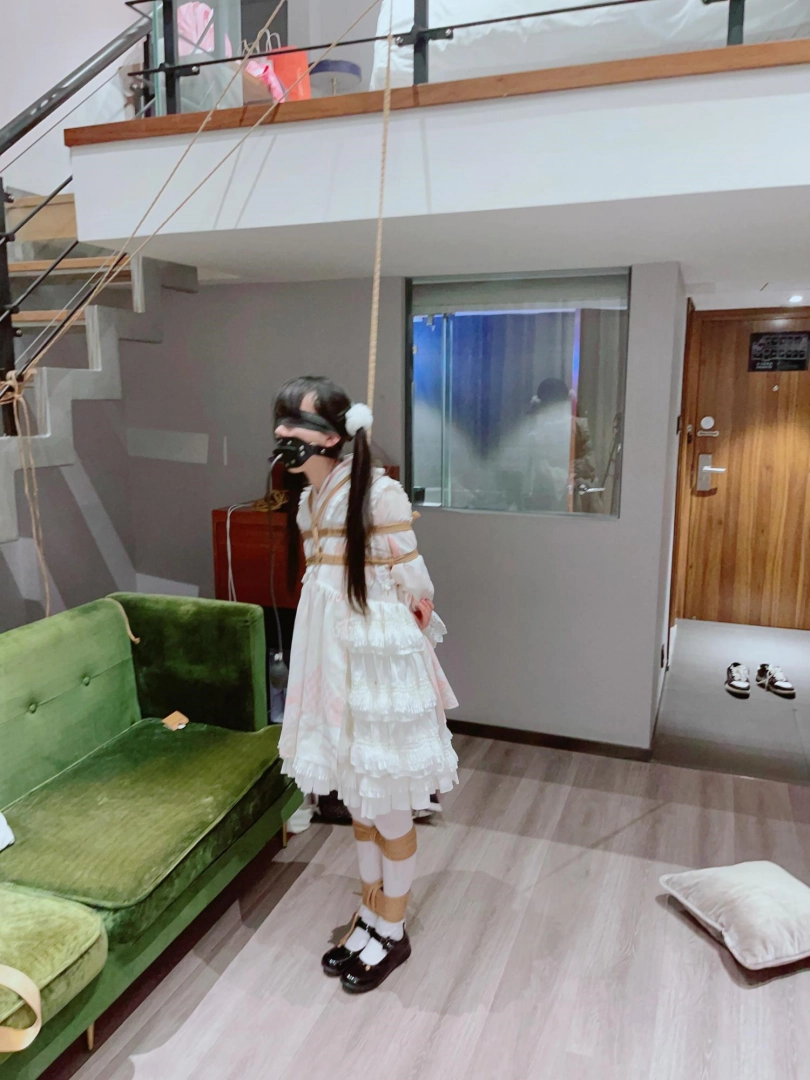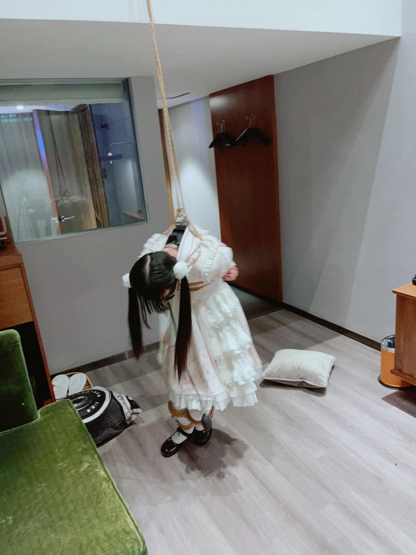 3.就这么折磨了一小时左右,茶茶突然崩溃大哭,拼命挣扎,不考虑任何重心,为了安全考虑我只能剪断了绳子,暂停拍摄。但是体力压榨不会这么轻松结束,我劝了茶茶几分钟,然后把茶茶双手举高,继续吊缚,双手举高罚站了十几分钟,直到茶茶完全疲劳绝望才放开茶茶。