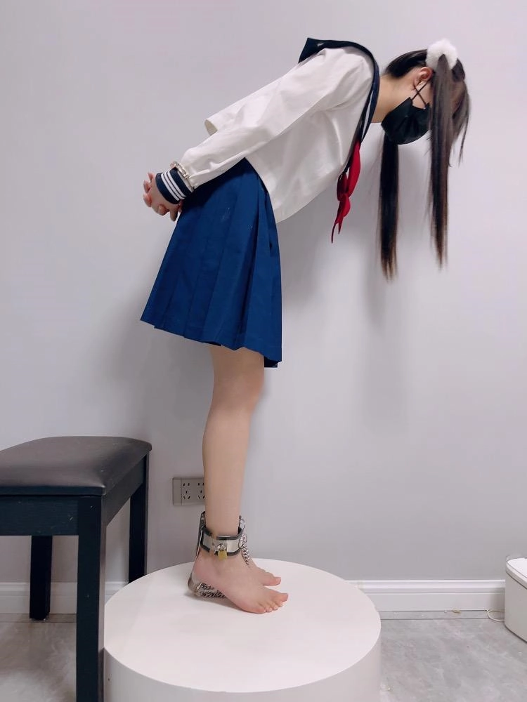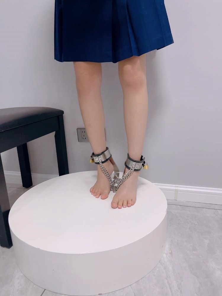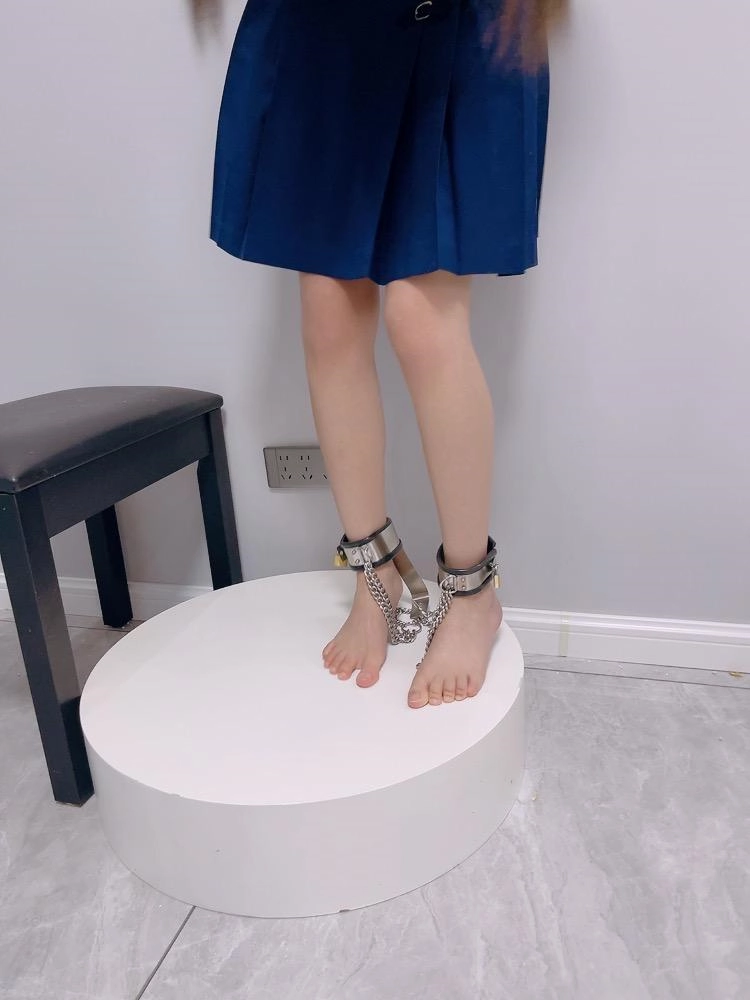 茶茶双手用最紧的板铐铐紧,且锁孔朝上。裸足小脚也穿上强制踮脚虐足器,强制在展示台上罚站。中间还把虐足脚镣的铁链互相锁到一起,只有10厘米左右移动空间,且全身重量都在脚趾上,虐的茶茶小腿颤抖,求饶。