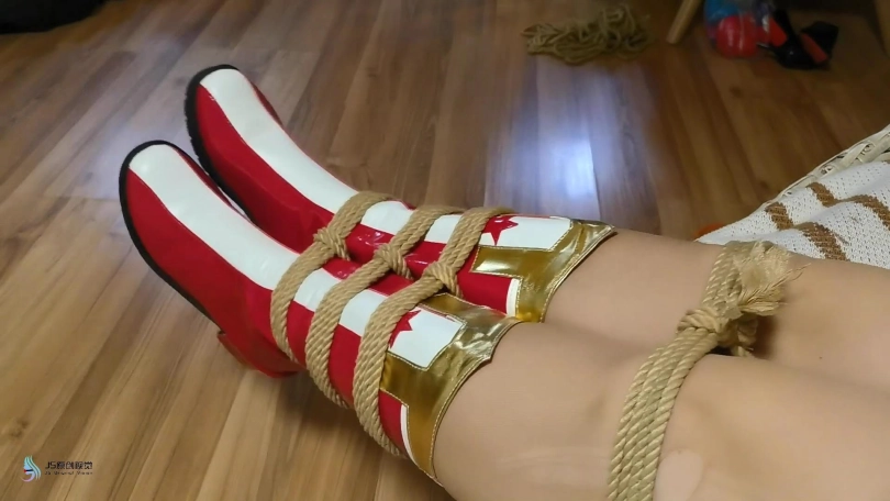 近期发生多起少女失踪案,神奇女侠来到一处房间调查。就在女侠查看时,房间突然窜出多条绳子缠住了女侠的全身。女侠惊慌的挣扎着,但她的双臂被绳子拉扯到背后牢牢捆绑着。脚上的绳子也拉紧,女侠没有站稳掉了下去。女侠的全身被绳子密密麻麻的捆绑着。这时绳子圈着一个口球塞进了女侠的嘴里,又出现一个TD放进了女侠的裆部。