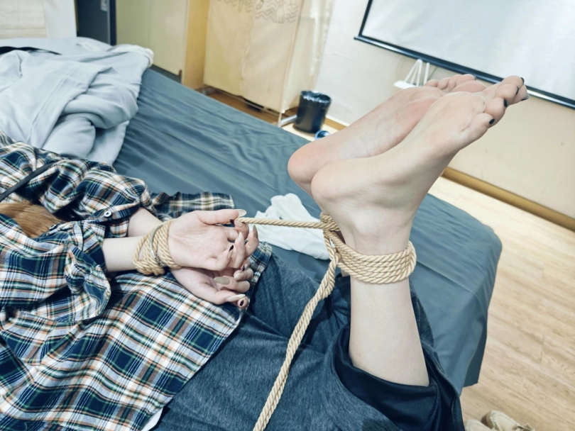 新人果果,一位漂亮的兼职大学生,白袜、玉足特写,还没了解过程就先绑了,也是比较累随便绑绑,事后感受说有点害怕,但是又不完全害怕,脚很美、白袜走了一天有点脏入味,人也很美,很怕痒但是能忍