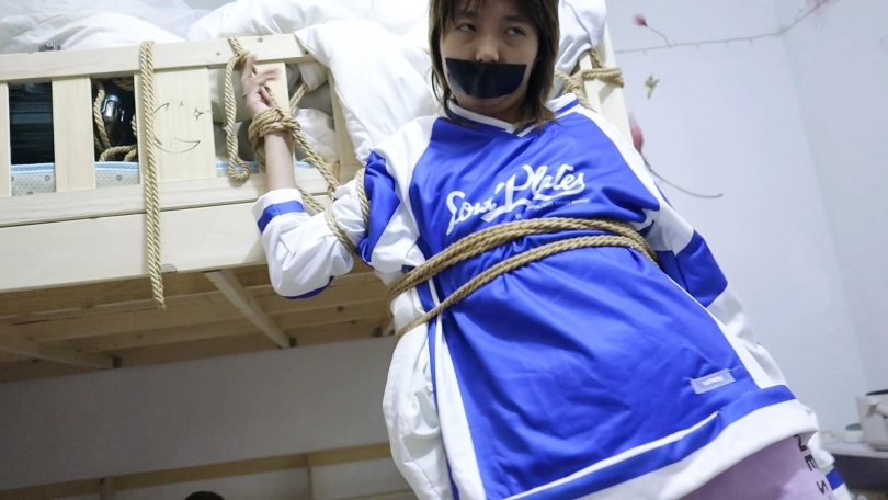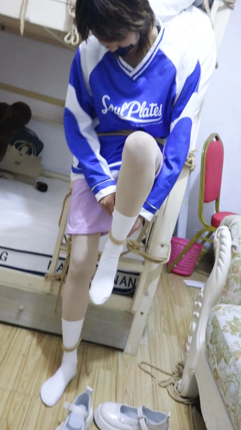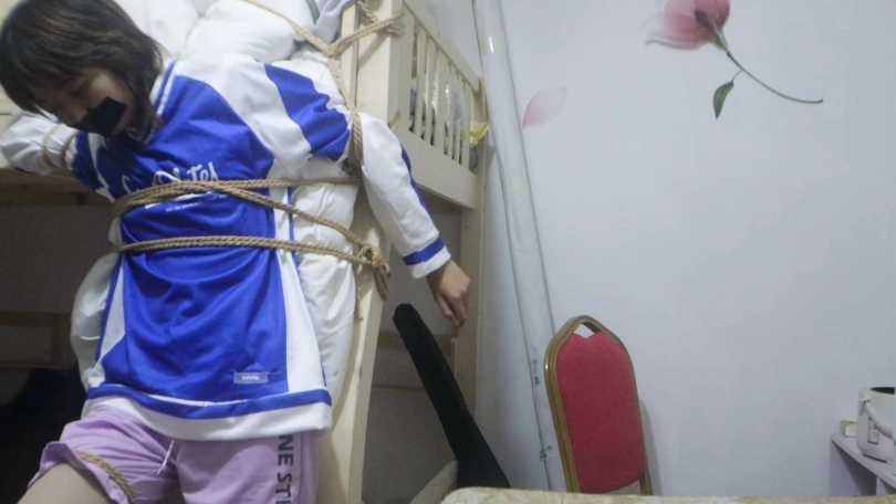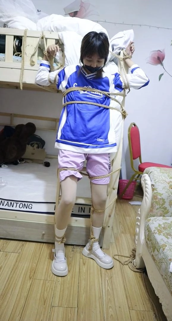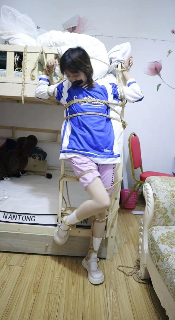 【荷仙少女】捕捉少女B本本逃脱绳子束缚中的微表情 绑在上下床楼梯中的多条绳子束缚 各种痛苦挣扎表情自己慢慢解开途中还要被男主各种侵袭 以及最后逃出生天的放松感