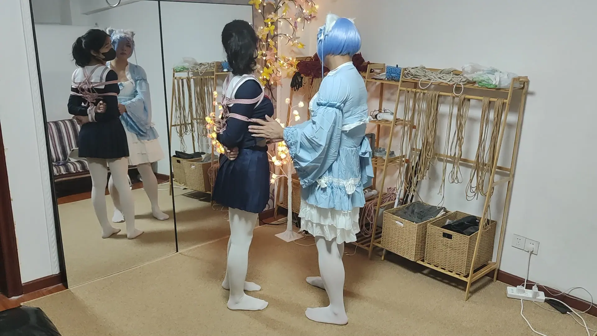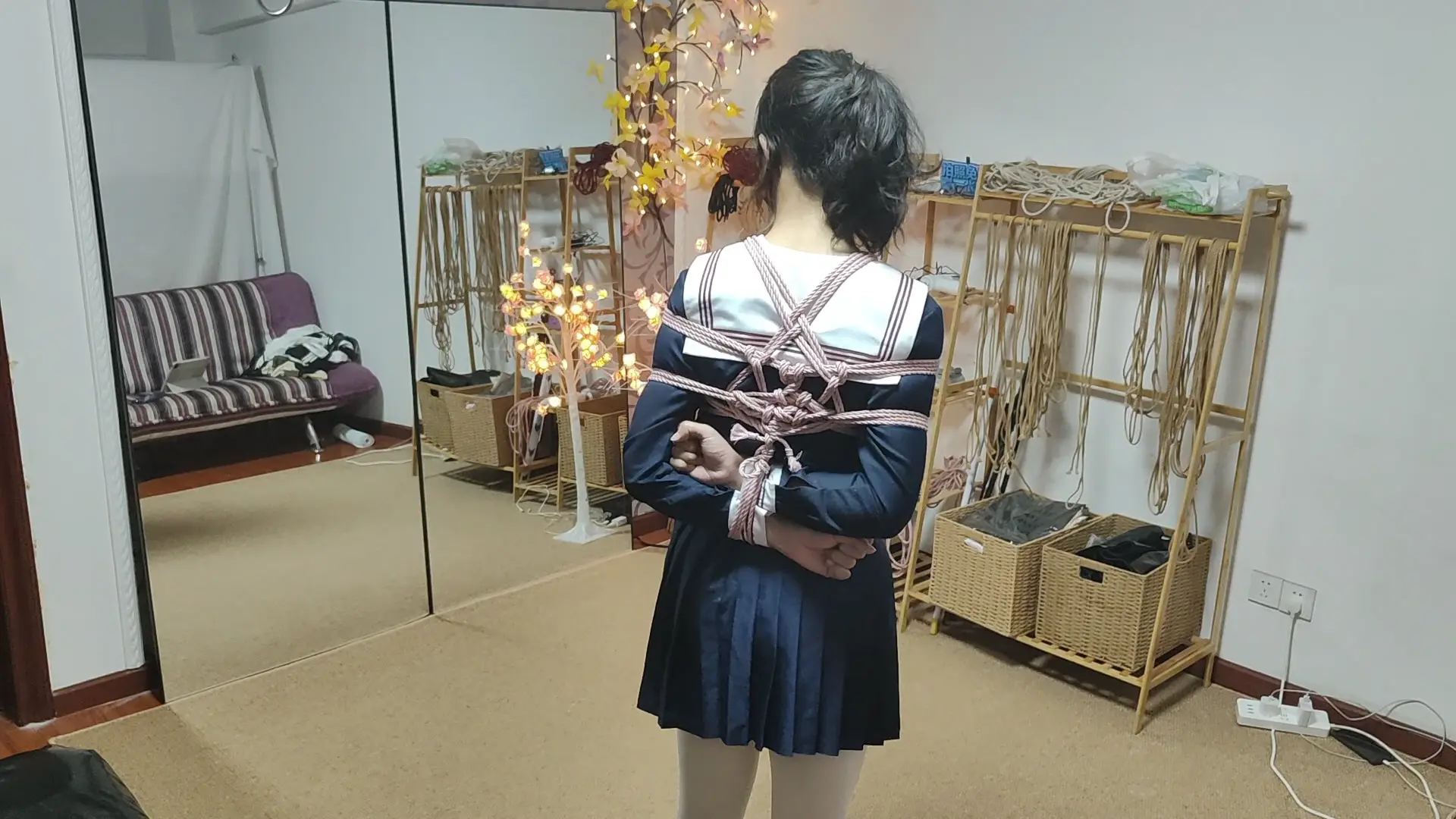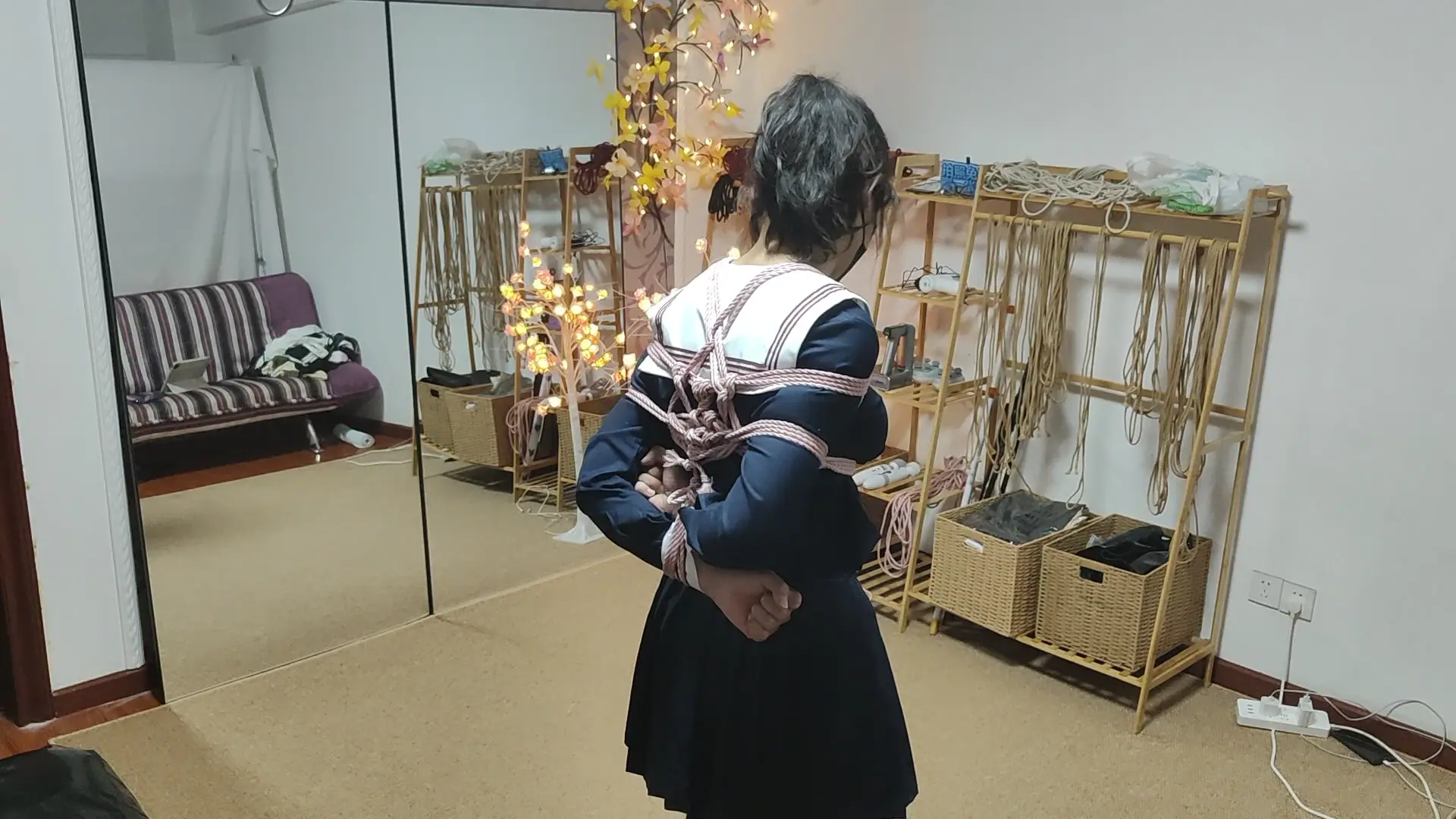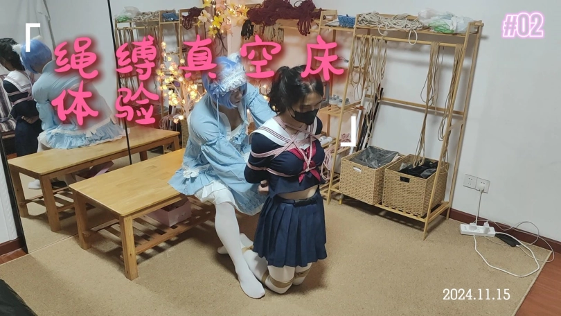 小m身着绀色白领水手服,长到大腿根的长筒白丝,上半身用粉绳捆上日式后手缚,下半身是原色麻绳捆上的4道双柱缚,看小m怎么在这样的条件下于真空床里快活吧。