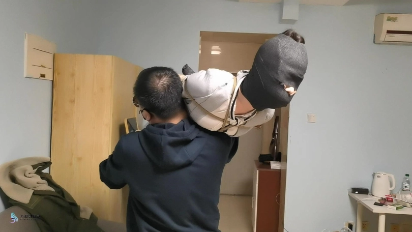王哥已经将毛巾顺势塞进了夏瑾的嘴巴并且反剪了她的双手,用绳子绑了起来。夏瑾激烈反抗挣扎但是徒劳无功,嘴里不断地透过堵嘴毛巾发出声音。最终,还是被结结实实地绑了起来。