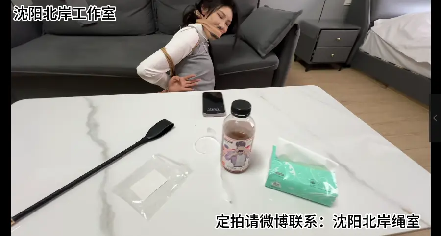 把嘉嘉翻过身来接着拍照,拿剪刀剪掉嘉嘉的毛背心。嘉嘉的腿被绑成M字,手被反剪绑到背后。