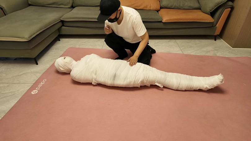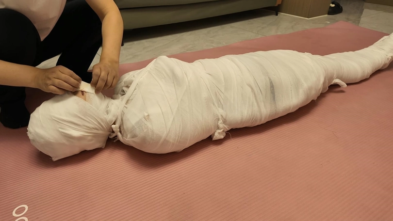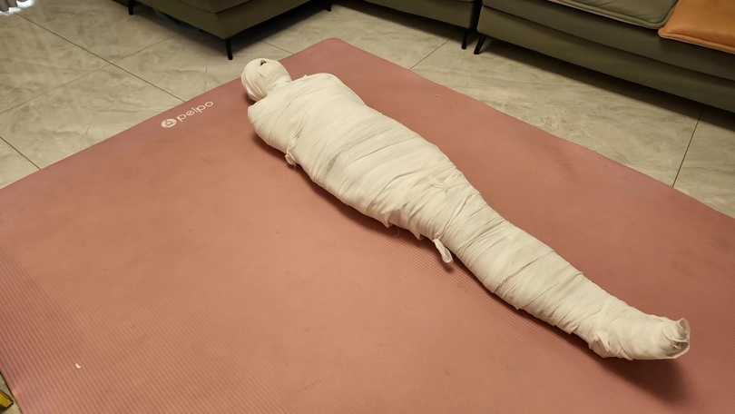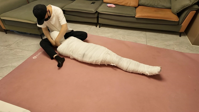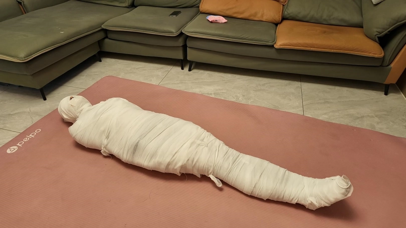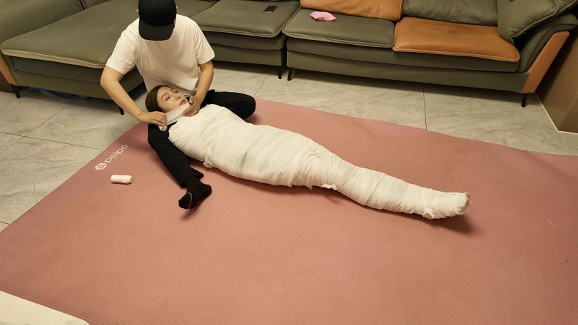 第一次和佳佳玩木乃伊,这次是佳佳主动要求的,绷带已经买了了好久了,偶然之间她看到了,问我是干啥用的,告诉她是玩木乃伊用的,就一直想玩,不过她没有想到不是单单缠绕起来,里面是要放跳D的,缠好,留出嘴巴,因为要听她呻吟,先用胶带粘上,这下就由不得她了,一直玩到没电,因为时间太长,所以分了上下两集,最后问她,高超了无数次,太刺激了