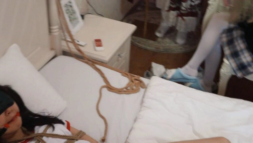 放上去之后,安好开关,呜呜呜 少女开始惊恐的大叫 双蛋一起震动 极其敏感老师趁机拿起口球往少女的嘴里塞去,少女想大叫,可是嘴巴被口球塞住 无法叫出声来,只能发出呜呜呜的声音 腿又被老师绑成M开脚缚,老师把棒棒放到穿着运动的短裤少女下面 另一个女生面无表情的玩着手机看着自己的好闺蜜被调教无动于衷,