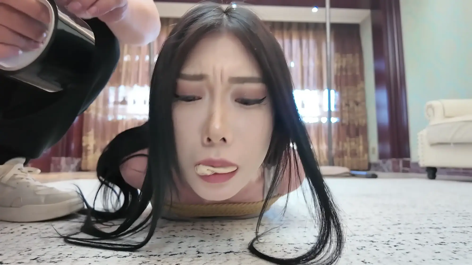 男人出现,告诉芷溪,这下发现没那么好逃脱了吧。芷溪愤怒地让男人把她的绳子解开,却被告知在真实绑架中,绑匪可不会因为她的要求就解开绳子,相反他用袜子把女孩的嘴堵上,并用胶带缠死。这下,芷溪只能用愤怒的眼神瞪着男人,发出抗议的呜呜声。