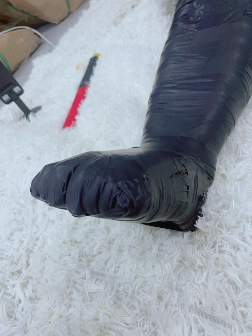 内容:作为上半部分,首先展示的是完整的全包过程。用保鲜膜打底后,贴上胶带。值得一提的是模特口中还带了奶嘴口塞,然后用保鲜膜和胶带封住头部。我选择了更复杂的胶带封头而不是头套,希望解开的困难可以给模特带来更严厉的心理体验。