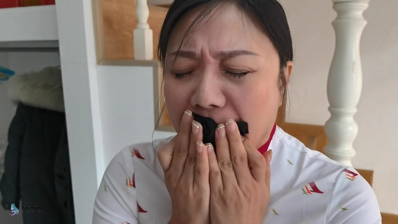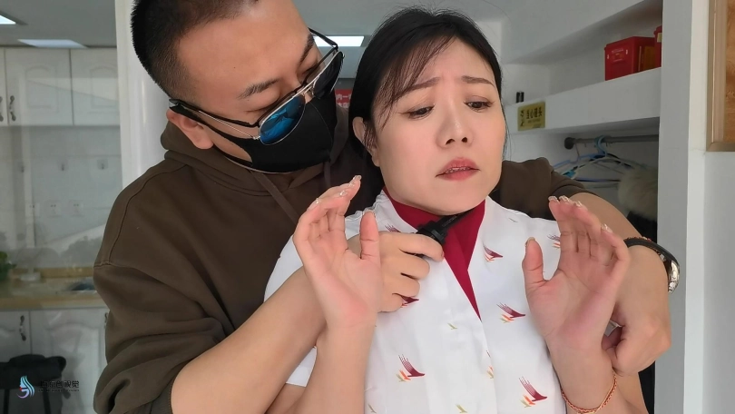 4.下一个镜头,这时空姐身上的绳子已被解开,贼人叫空姐把已吐出的丝袜再次塞回口中,并叫她把袜子往嘴内推进一点,塞得实一点。空姐在别无他法下,跟着贼人要求照做。完成后以眼神与贼人对望,并发出呜呜声示意已把袜子塞到嘴里的最内处。贼人跟着以1块胶带把空姐的嘴紧紧封上。跟着贼人便叫空姐把双手举高,然后贼人便把空姐的制服裙上的拉链打开,贼人并亲自将她的制服裙脱下,跟着便命令空姐把制服襯衣及丝袜脱掉,他要求空姐在完成后,再把高跟鞋穿回。空姐随即以手掩盖胸部并尴尬地摇着头,亦从嘴里发出「你要錢我可以給你,但我不要脱衣服」的声音。贼人这时以已更凶狠的语气说「立即脱下」。空姐惊慌下,唯有按着做。鏡頭一轉,空姐被绑在一张椅子上身上,只穿着内衣及高跟鞋。她的双手被反绑在椅子后,胸部的上方及下方被绳子绑着,双腿足踝被分开,分别绑在椅子的椅脚上。