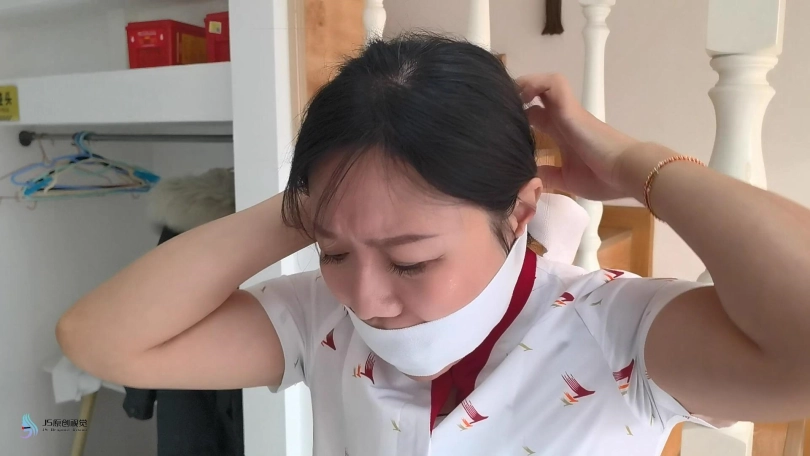 6.下一个镜头,贼人便叫空姐背向他,并叫空姐双手放在背后,随即以扎带把空姐的手腕、膝蓋以上及足踝绑起来(绑紧一点,剩余的扎带请剪去),并把它放置坐在客厅中的沙发上。空姐仍然只穿着内衣及高跟鞋,但发髻已被解开。贼人跟着以1块毛巾把空姐的嘴紧紧堵上。在绑好空姐后,贼人便对空姐说「我现在外出拿钱,如果你没有骗我的话,我在拿到钱后便会找警察上来放你,你现在最好老实一点,乖乖待着」空姐望着贼人一面发出呜呜声一面点了点头。空姐在贼人离开后,疯狂地挣扎着,并从嘴里不停发出叫喊声,希望引起附近房子居民的注意。由于天气炎热,空姐的脸上及身上也布满了汗珠。空姐挣扎了一會後,便改變了姿勢,坐在地上,背靠沙发,繼續扭动着身体挣扎。過了一會,空姐以被反綁的雙手按首沙發站了起來,並跳向客厅的窗旁。过程中她固意发出声响,引起该男子注意。这时女人慢慢扭动着坐在地上的臀部,从嘴里隔着毛巾大喊:「救命」。过了1小时后,警察到达门外拍门并在门外问是否发生了什么事?这时空姐快速跳到大门,并靠近大门,从嘴里隔着胶带大喊:「救命,救我」。