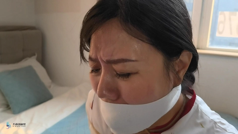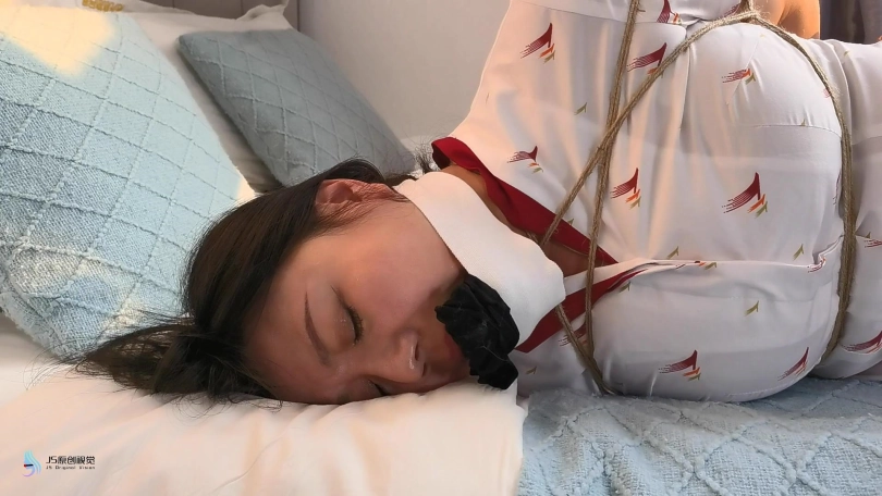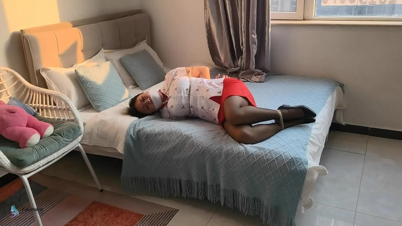 3.下一个镜头,这时的空姐已被绳子紧紧绑起胸部手腕及足踝亦被绳子绑着。贼人捆绑空姐后,便叫她跳到睡房内,并安排她坐在床上跟着便再对空姐说「我现在在你的房子里搜索贵重物品,你最好配合,要不然弄死你。“空姐惊慌地望着贼人,从嘴里发出呜呜声并点头示意会配合。空姐在贼人离开睡房后,便尝试挣扎,不停扭动身躯,并不停发出呜呜声,希望外边房子的其他人能听到自己的呼救。空姐一开始是坐在床上挣扎,过了一会后,便开始觉得乏力疲倦,她的脸上也充满了汗珠。空姐跟着便侧卧在床上。继续扭动着身躯。由于扭动身躯的关系,她身上短裙也被牵高了一些,露出了丝袜及內里的内裤。空姐在挣扎了一会后,好不容易才把口上盖着的布条移除并吐出嘴里的丝袜。那只被吐出的丝袜,充满了空姐的唾液。