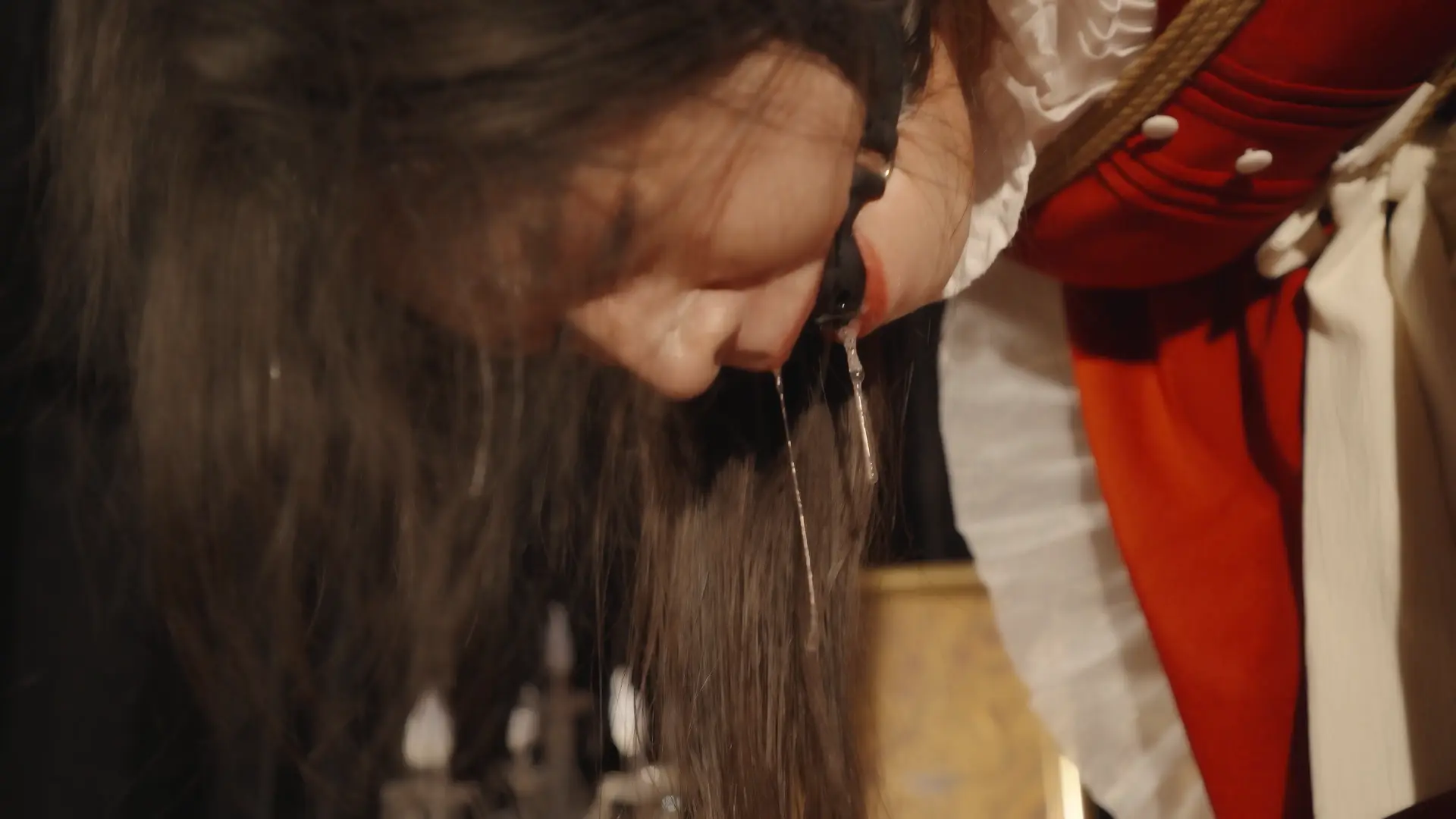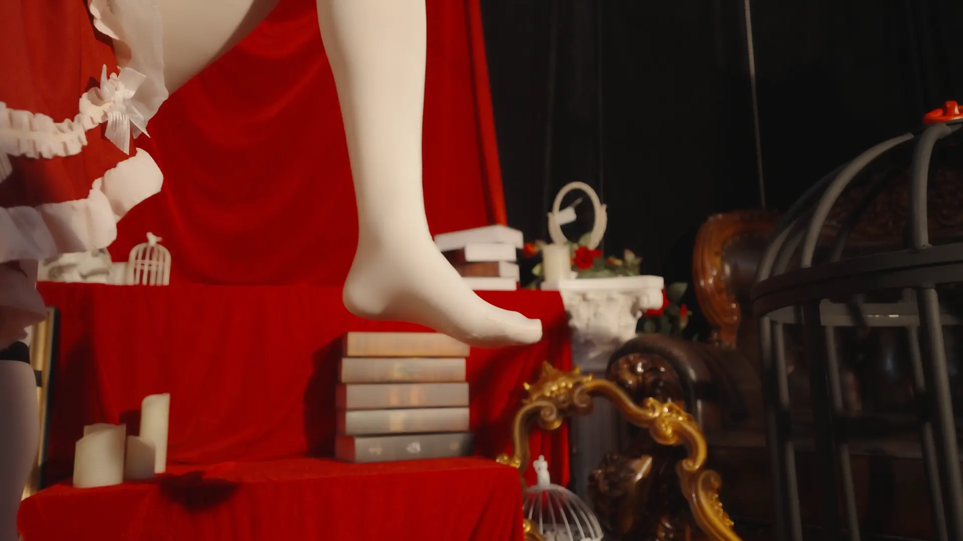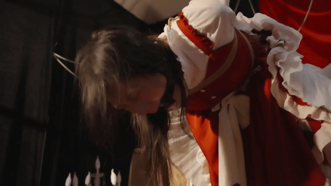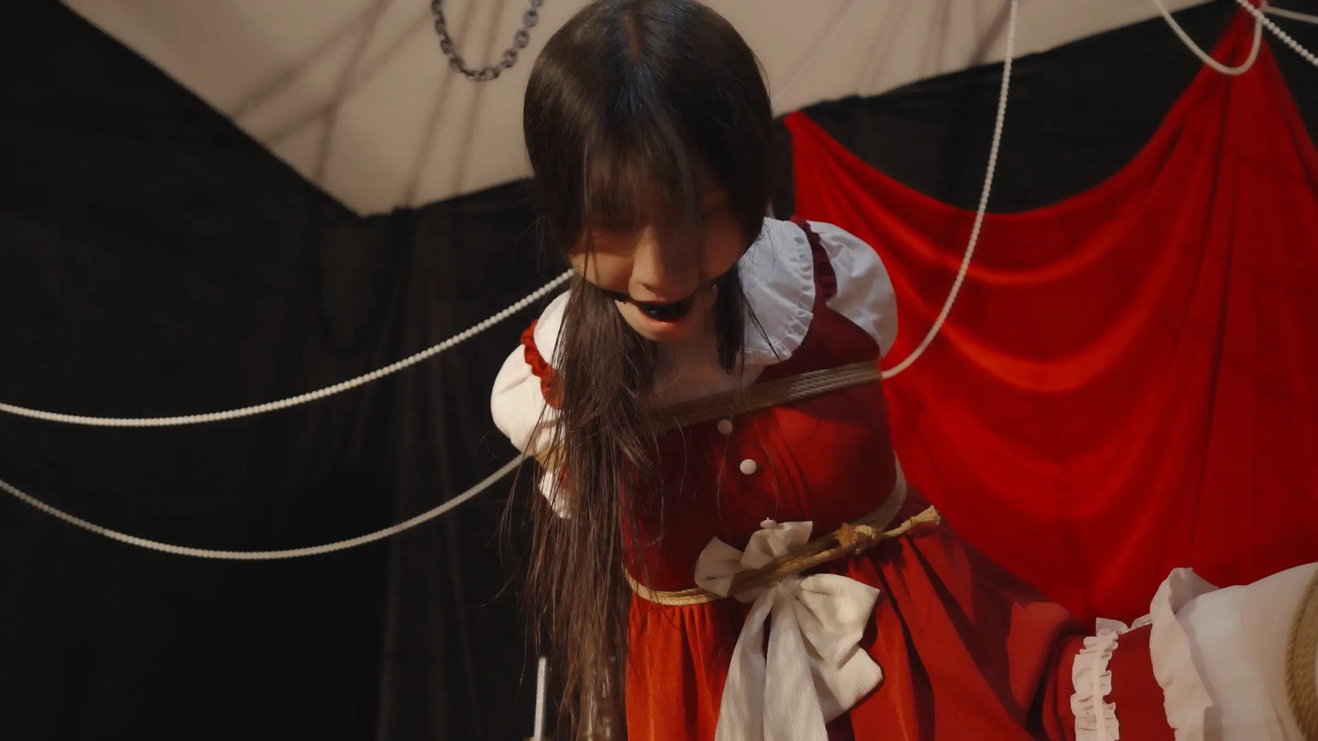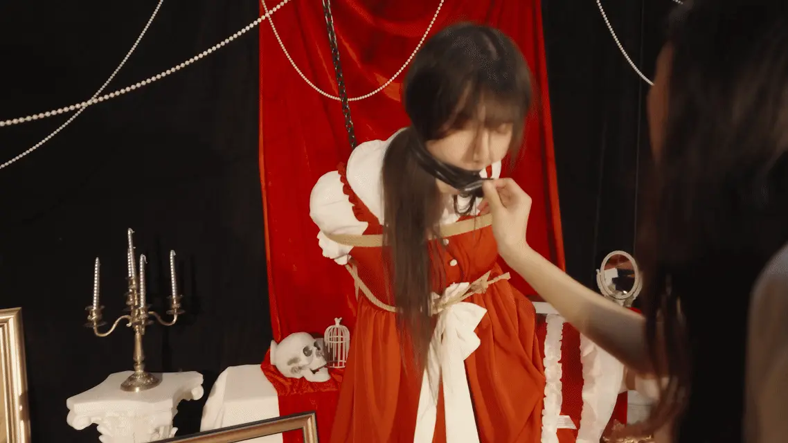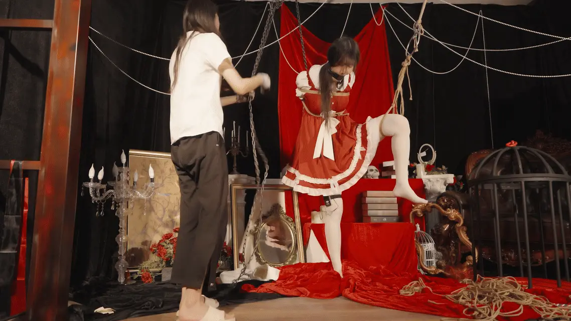 哥特房间里,少女双臂被狠狠地用绳子捆在一起并被起重机吊在屋顶,随着时间的推移知觉渐失。在这中世纪欧洲的阴森穹顶下,响彻着无助的哀嚎和痛苦的呻吟,不知是否是疼痛带来的[X_X]竟让少女步入[X_X],灯光闪烁,帷幕落下,身上的鞭痕和身上的汗水无声控诉着刚刚发生的一切,悲戚漫过腐朽梁柱。